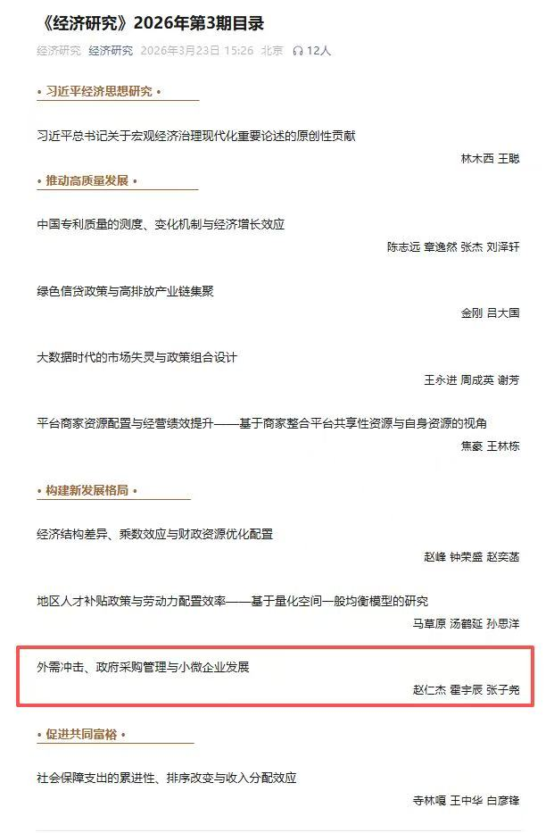 近日,太阳集团城经济管理学院赵仁杰教授与霍宇辰博士等合作的论文《外需冲击、政府采购管理与小微企业发展》在顶级期刊《经济研究》2026年第3期发表,该文是赵仁杰教授主持的国家自然科学基金面上项目、陕西高校青年创新团队项目的阶段性成果。