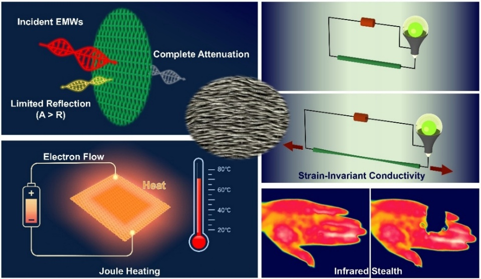 该成果在多个方面取得了突破。一是器件结构创新,Fe‑EGaIn/TPU 核‑壳纤维在保持超高可拉伸性的同时,成功集成焦耳热、红外隐身、应变不敏感导电与电磁屏蔽等多功能;二是实现应变不敏感导电,纤维在 100% 应变下电阻变化仅为‑6%,表现出接近应变无关的优异导电稳定性,研究还结合 COMSOL 模拟,揭示了拉伸载荷下导电网络保持稳定的作用机制;三是构建织物级吸收主导型电磁屏蔽,将纤维经经纬正交编织成织物后,仅需 7 wt% 的 Fe 含量即可实现吸收占优的高效电磁屏蔽,在保证可穿戴织物柔性与舒适性的前提下显著提升屏蔽性能。