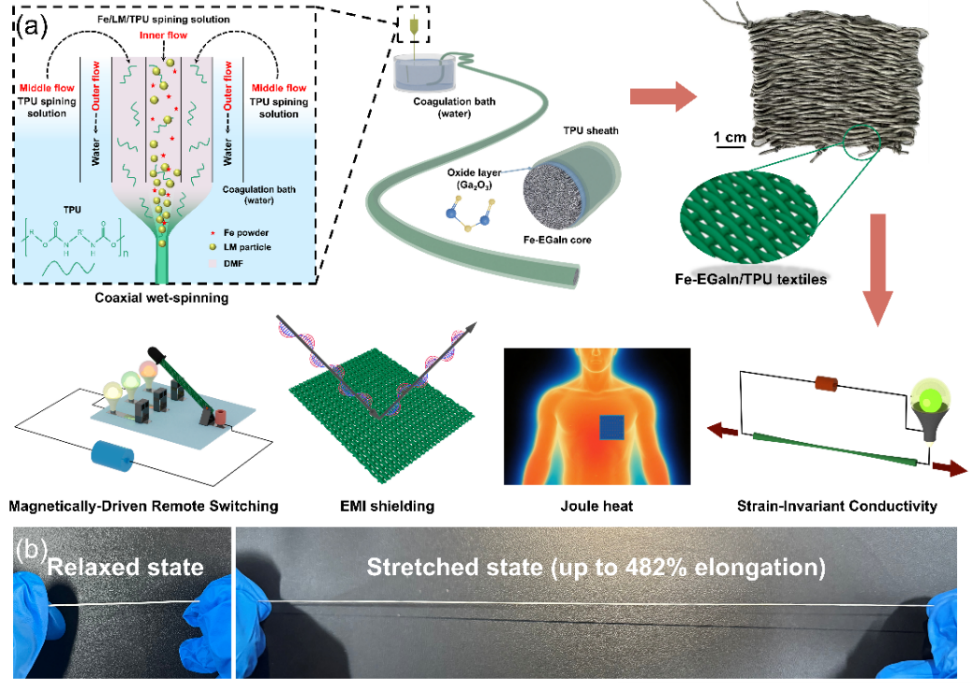 近日,太阳集团城化工学院范代娣教授、李若松副教授团队联合复旦大学等单位,围绕柔性可穿戴电子在大形变条件下面临的导电衰减等难题,提出并构筑了一种同轴湿法纺丝结合冻压活化的液态金属纤维策略。团队构建了Fe-EGaIn/TPU核-壳液态金属纤维及其织物平台,实现高导电与超高延展,并具备应变不敏感导电,同时在织物形态下获得吸收占优的电磁屏蔽能力。此外,依托低电压可控焦耳热与红外热信号抑制,该织物可面向生物与可穿戴应用拓展:用于贴肤热管理/热疗与康复护理织物、可穿戴生理传感系统的稳定互连与布线层、医院/临床电磁环境下的个体防护及设备柔性屏蔽外罩,并为手术室或隔离病房等场景的无接触交互与指示控制提供材料基础。