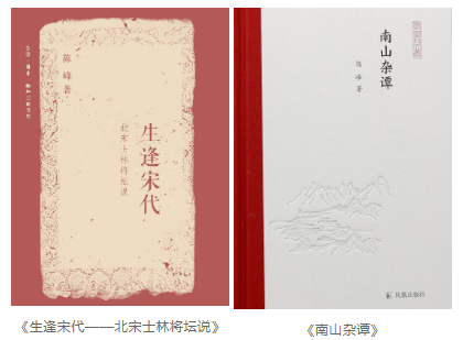 2013年,陈峰将前期发表的历史散文以《生逢宋代——北宋士林将坛说》为名出版。全书取材正史、野史、文集、笔记、方志等,熔裁于叙事中,读者在轻松阅读中可以逐一领会宋代的君权与相权、国事与党争、内政与边防、崇文抑武与军力升降等重大关节。该书不仅再版,还在海外发行了繁体字版,获得了教育部第七届高等学校科学研究优秀成果普及奖(该项系首次设立)。2022年,陈峰又将其他的随笔、札记、书评及序记,汇编结集为《南山杂谭》出版。