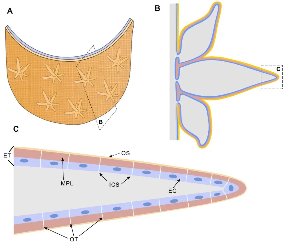 团队利用显微CT、聚焦离子束-电镜联用等技术,对数百枚仅300微米的骨片开展亚微米级扫描,发现表面保存完整的蜂巢状多边形网,其形态、尺度与现生珠母贝棱柱层有机质框架高度一致,表明矿化过程受表皮细胞严密调控。研究据此推断,5亿年前的开腔骨类已具备现代真后生动物“上皮组织诱导、有机框架成骨”机制,否定了其属海绵动物的传统认识。