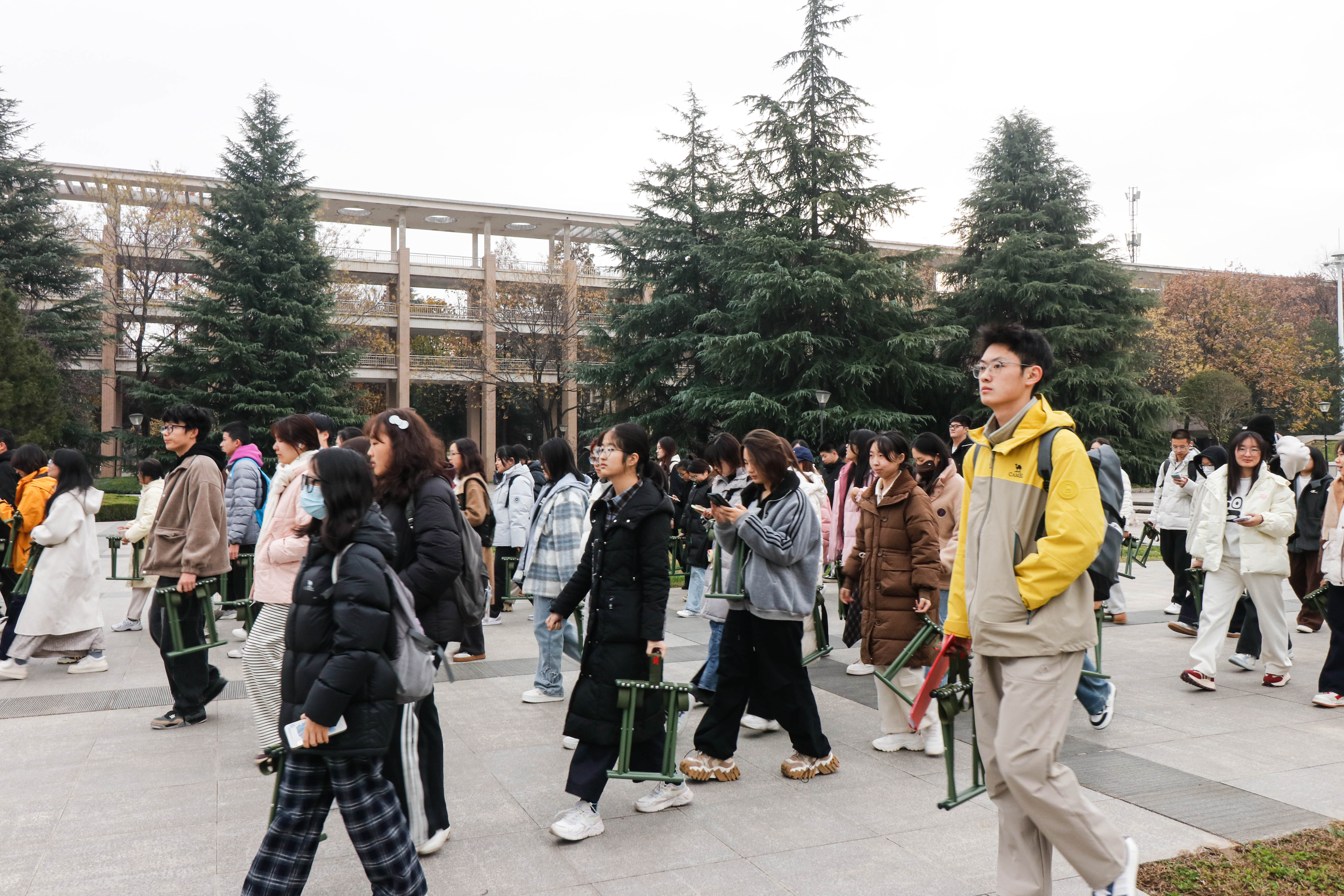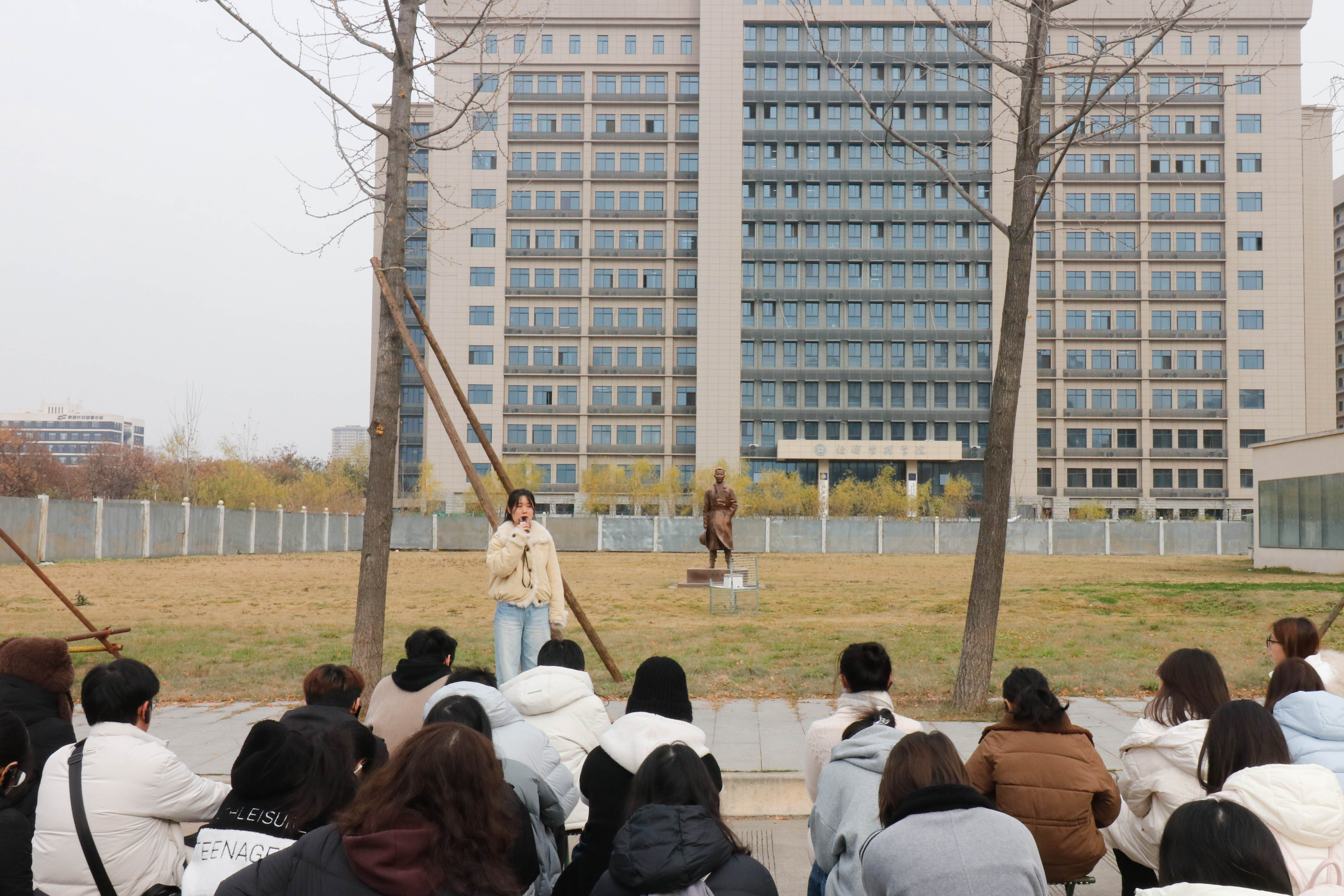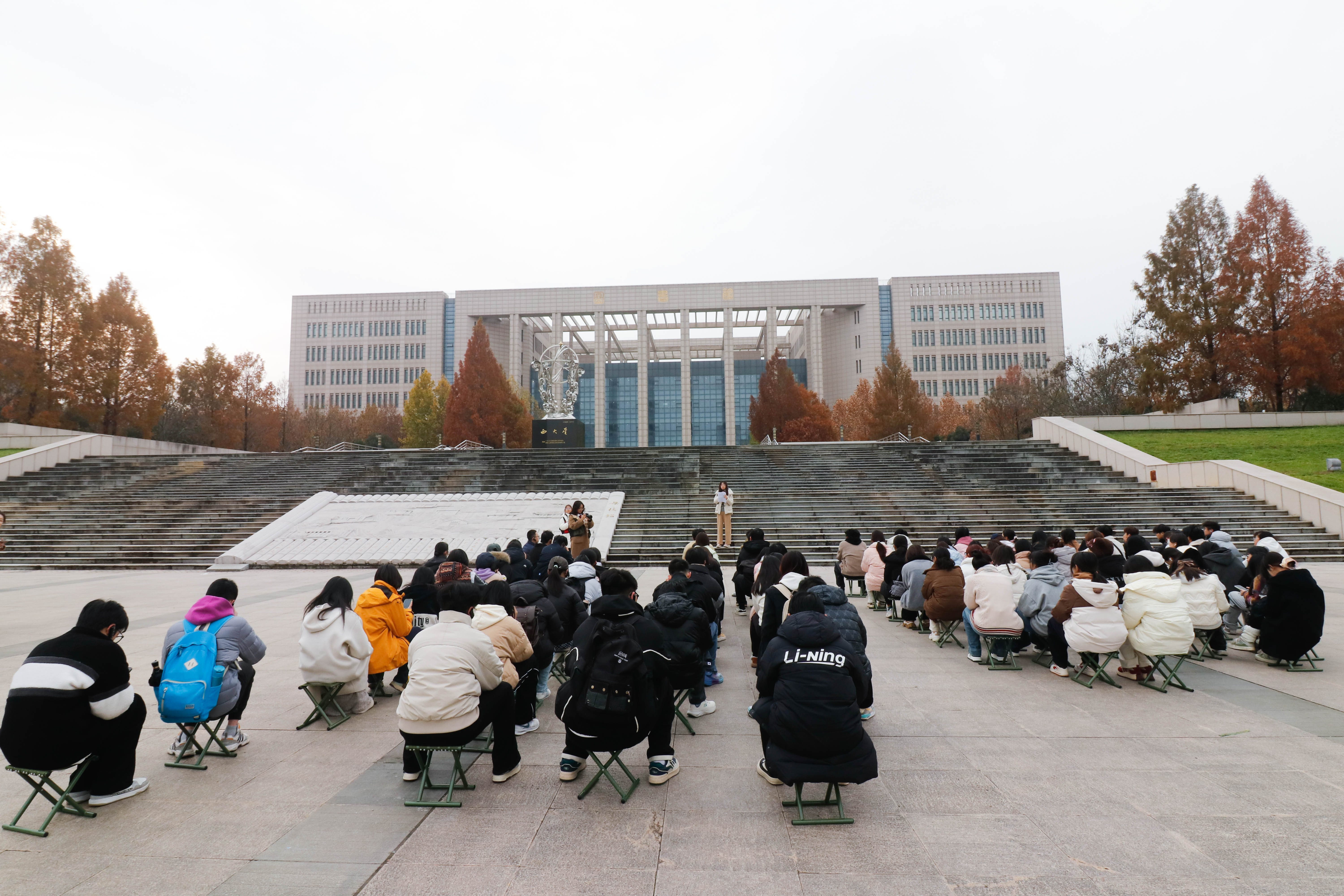 学生在图书馆前集体听讲