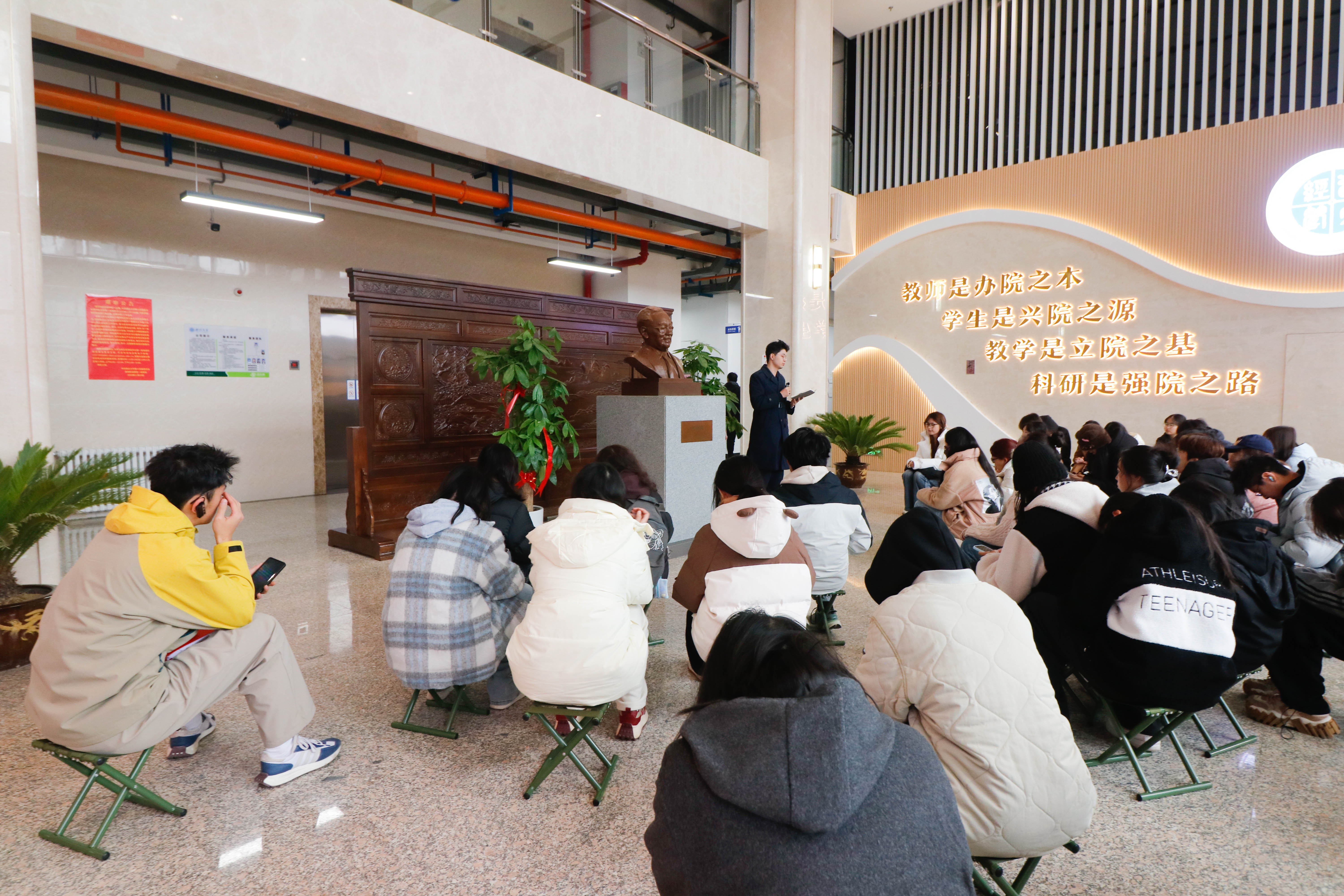 课程从“xida星”和“母校铭”百廿校庆文化景观开始。同学们在老师们的带领下,从中心广场穿行而过,罗健夫先生的赤诚、齐越先生的坚守在雕塑旁愈发清晰;“国立西北联合大学校歌纪念石”前,铿锵有力的歌词让同学们深切感受烽火中的办学初心;“学堂厅”的屋檐下,西大的建校脉络在讲解中逐渐明晰。沿校园环道,王戍堂先生的学术坚守、熊庆来先生的育人情怀、高鸿先生的科研热忱、何炼成先生的经世担当、傅角今先生的地理深耕、黄文弼先生的考古初心、侯伯宇先生的高尚无私、李仪祉先生的水利宏愿、张凤翙先生的教育星火——一座座人物雕塑前,英模事迹通过师长与学长学姐的生动讲述变得可感可及。在郭峰事迹展厅内,珍贵的史料与感人的故事,更让同学们对“奉献”二字有了真切体悟。行程的终点,所有人聚集在“国立西北联合大学”影壁前,共同解锁“公诚勤朴”校训背后的育人故事。