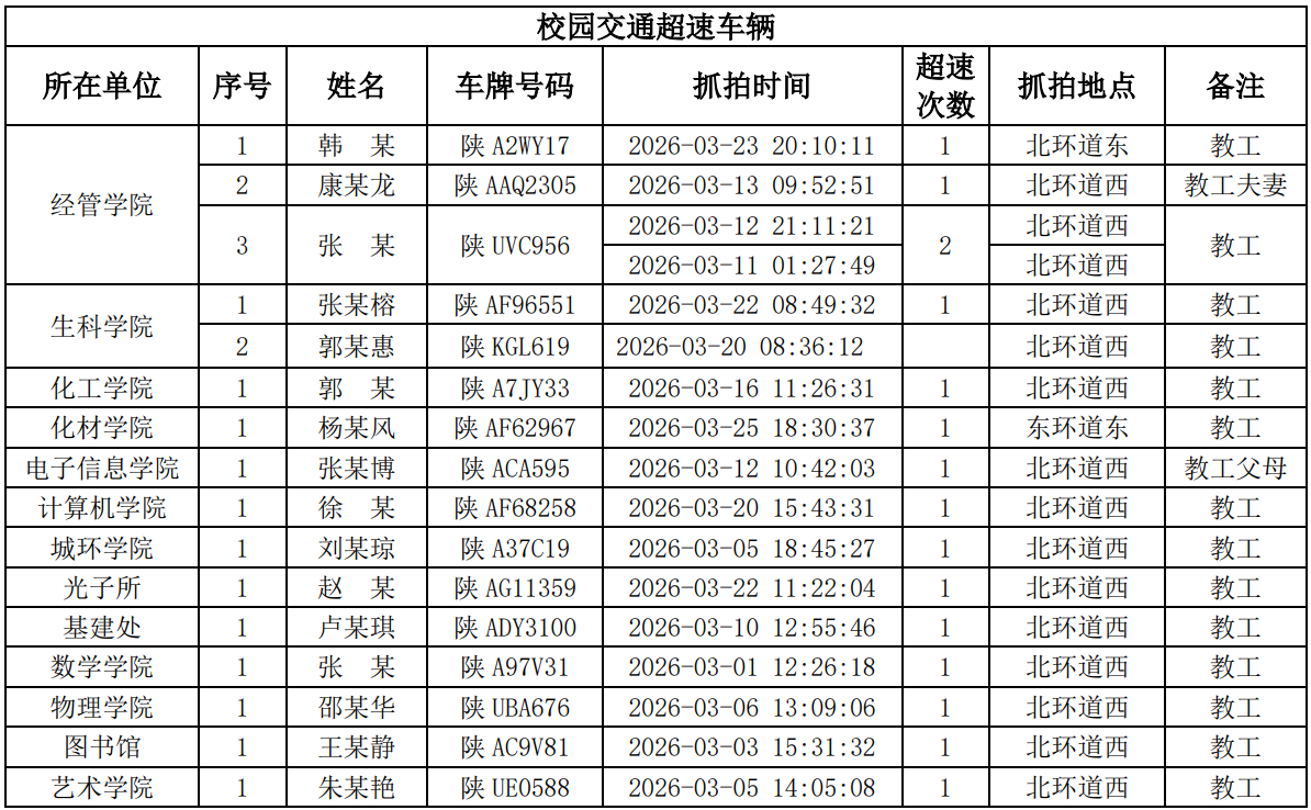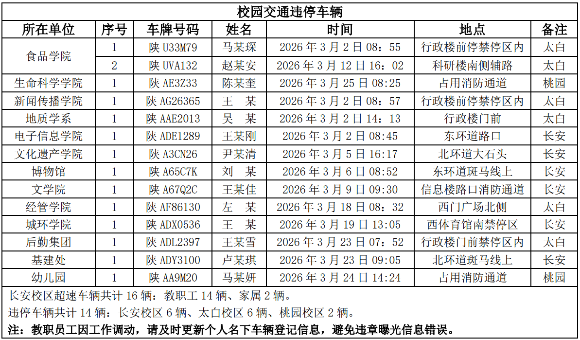 为进一步加强校园交通管理,保障校园交通安全有序,维护学校正常的教学、科研和生活秩序,切实保护师生员工的人身财产安全,根据《古天乐代言太阳集团城网址校园交通安全管理规定》的相关要求,现将2026年3月校园交通违章车辆予以曝光,具体要求与违章信息如下: