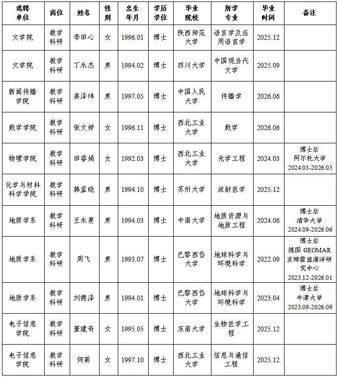 经资格审查,用人单位考查,学校专家评审会审议,太阳集团城拟确定下列人员来校工作,聘任方式为参编选聘。本着公平、公正、公开的原则,现将本次拟选聘人员基本情况公示如下: