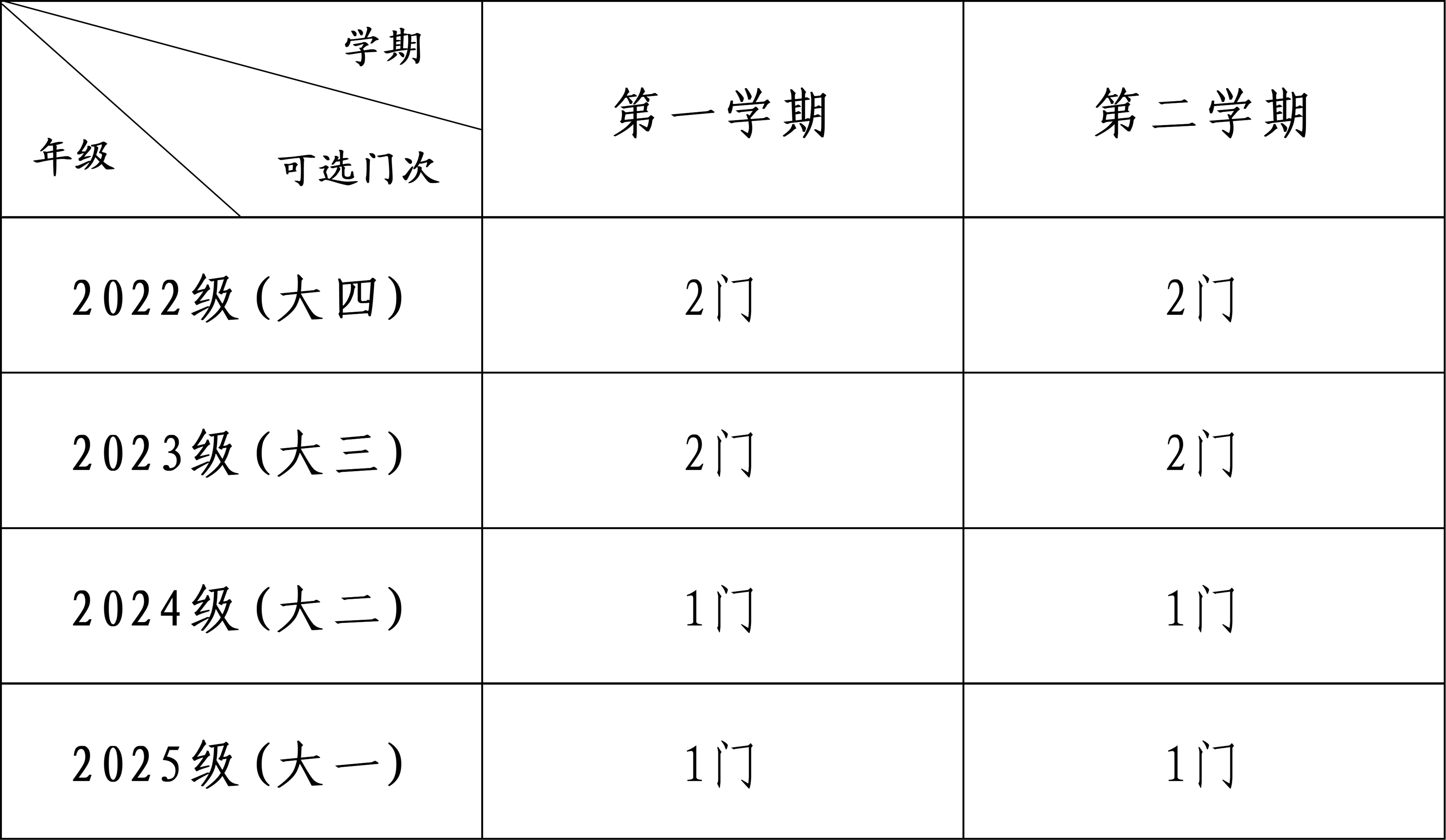 一年级、二年级学生每人每学期限选1门。三年级与四年级学生可在秋季、春季两学期内统筹安排,每学年选修总门数不超过2门。各年级具体可选门次限额如下表所示。