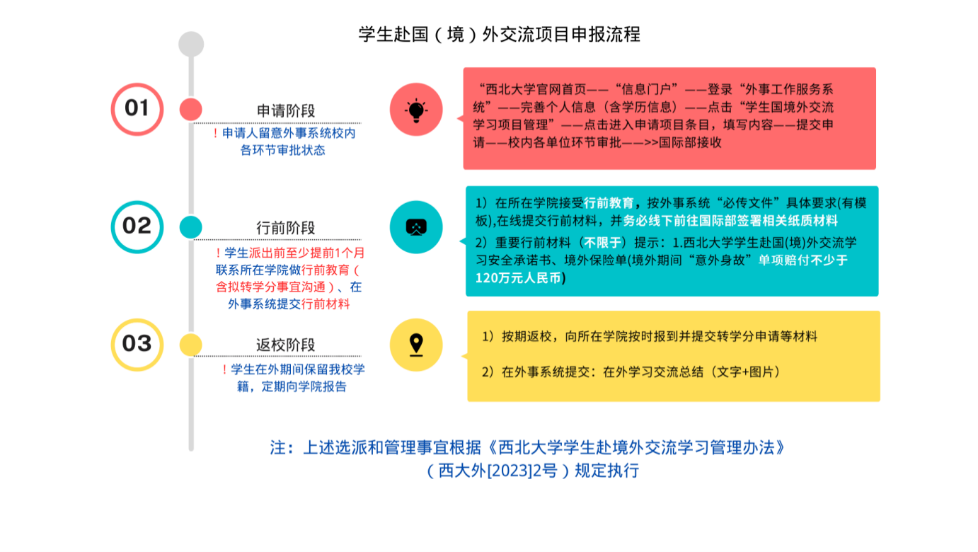 3. 申请学生在确定录取后,应及时履行出国(境)前相关行前手续。请务必了解有关本项目学生的申请、行前、返校阶段情况说明,请见附件 申报流程说明或下图。