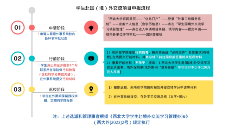 3. 在确定被录取后,学生应及时履行出国(境)前相关行前手续。有关本项目学生的申请、行前、返校阶段情况说明,请见下图。行前教育常见问题可查阅https://kdocs.cn/l/crHi8O80mCFF