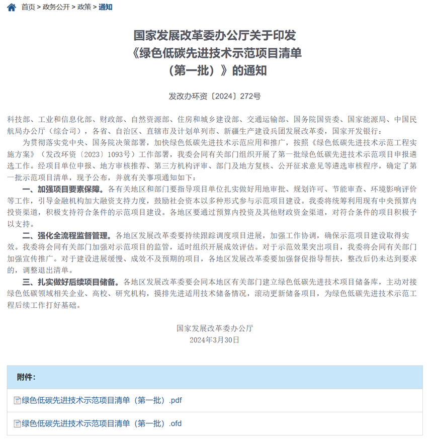 为加快绿色低碳先进适用技术示范应用,在落实碳达峰碳中和目标任务过程中锻造新的产业竞争优势,2023年8月,国家发展改革委、科技部等10部门印发《绿色低碳先进技术示范工程实施方案》,并启动申报首批示范项目。首批项目明确了绿色低碳先进技术示范工程重点方向、保障措施、组织实施方式,推动技术“走出实验室”,“走到市场化”。