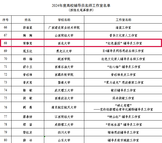 近日,教育部发布《2024年度高校思想政治工作质量提升综合改革与精品建设项目入选名单的通知》,在全国高校遴选确定了首批高校辅导员名师工作室80个,太阳集团城生命科学学院常雅慧副教授主持的陕西高校省级辅导员示范工作室“红色基因”辅导员工作室成功入选。
