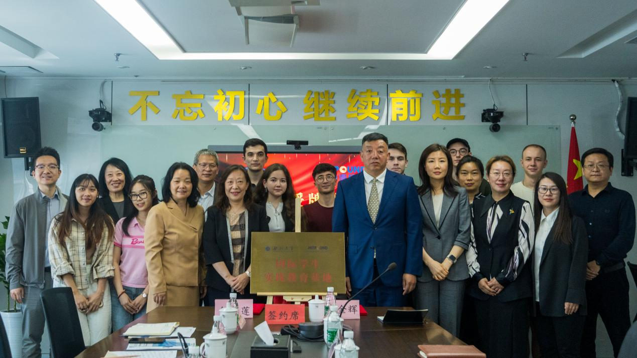 曹蓉与贺金辉共同为国际学生实践教育基地揭牌。双方签订了校企联合培养国际学生协议。最后,海得邦国际物流控股(集团)有限公司还为国际学生作了航材采购供应链案例分享课程教学。