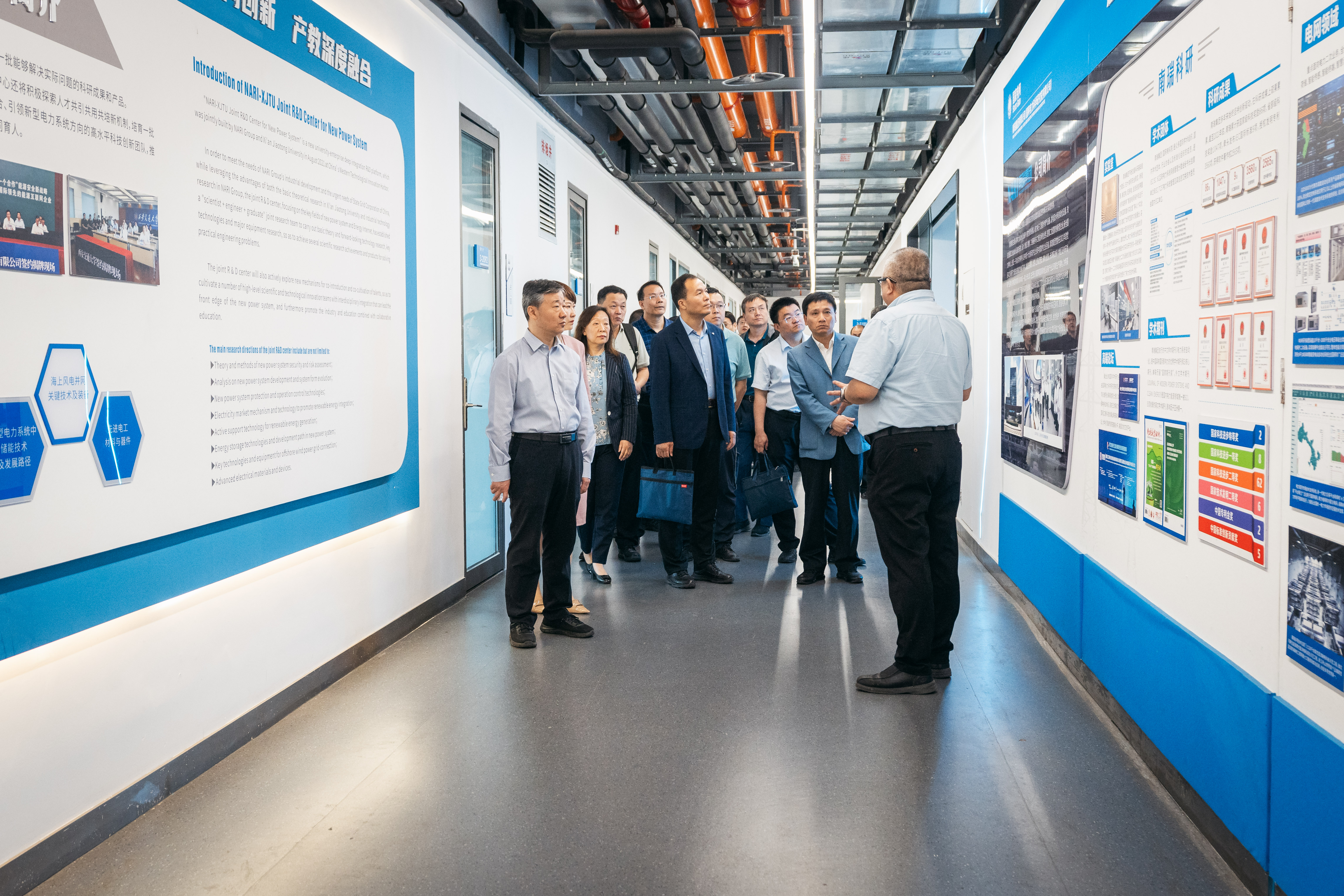 走出数字展厅,在西安交通大学党委副书记王欢的陪同下,大家来到电器科学与技术研究院。该研究院汇聚了西安交通大学与国家电网、华能集团、南瑞集团等龙头企业和院所共建的20多个联合研究机构。郝治国教授向大家介绍了这些联合研究机构的组织架构、管理方式和主攻方向。
