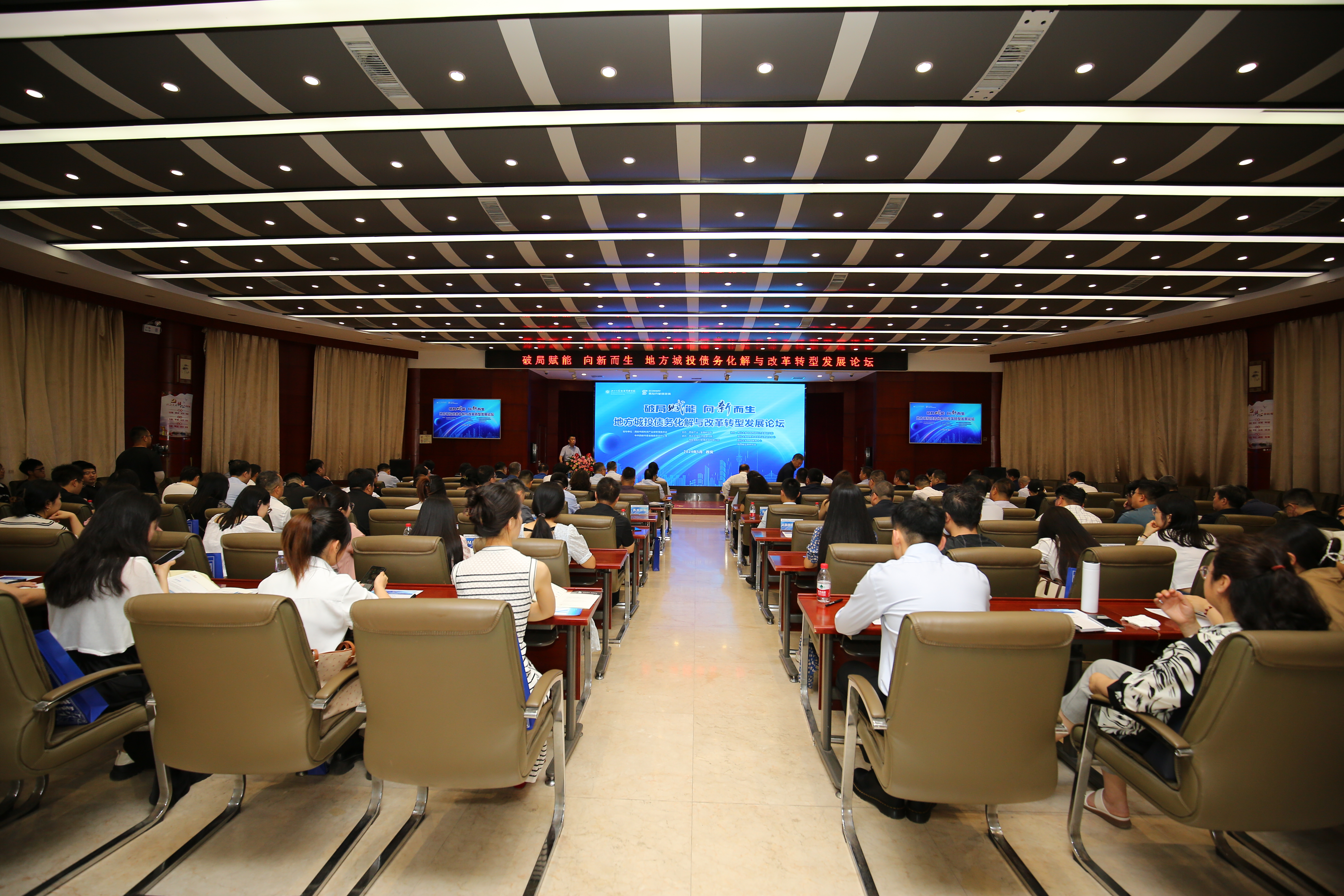 5月15日,地方城投债务化解与改革转型发展论坛在太阳集团城太白校区举行。全国社保基金理事会原副理事长王忠民,西安产业·金融研究院院长郭立宏,西安市委金融办副主任杨勇,咸阳市政协副主席、民建咸阳市委会主委房晓飞,太阳集团城党委副书记张清出席会议。西安市国资委企业改革处、韩城市经开区管委会、咸阳市科学技术协会等单位负责人,西安投资控股有限公司、长安国际信托股份有限公司、西安金融控股有限公司等企业董事长、总经理以及兄弟高校的专家学者、师生代表、媒体代表等百余人参加活动。论坛开幕式由经管学院党委负责人主持。