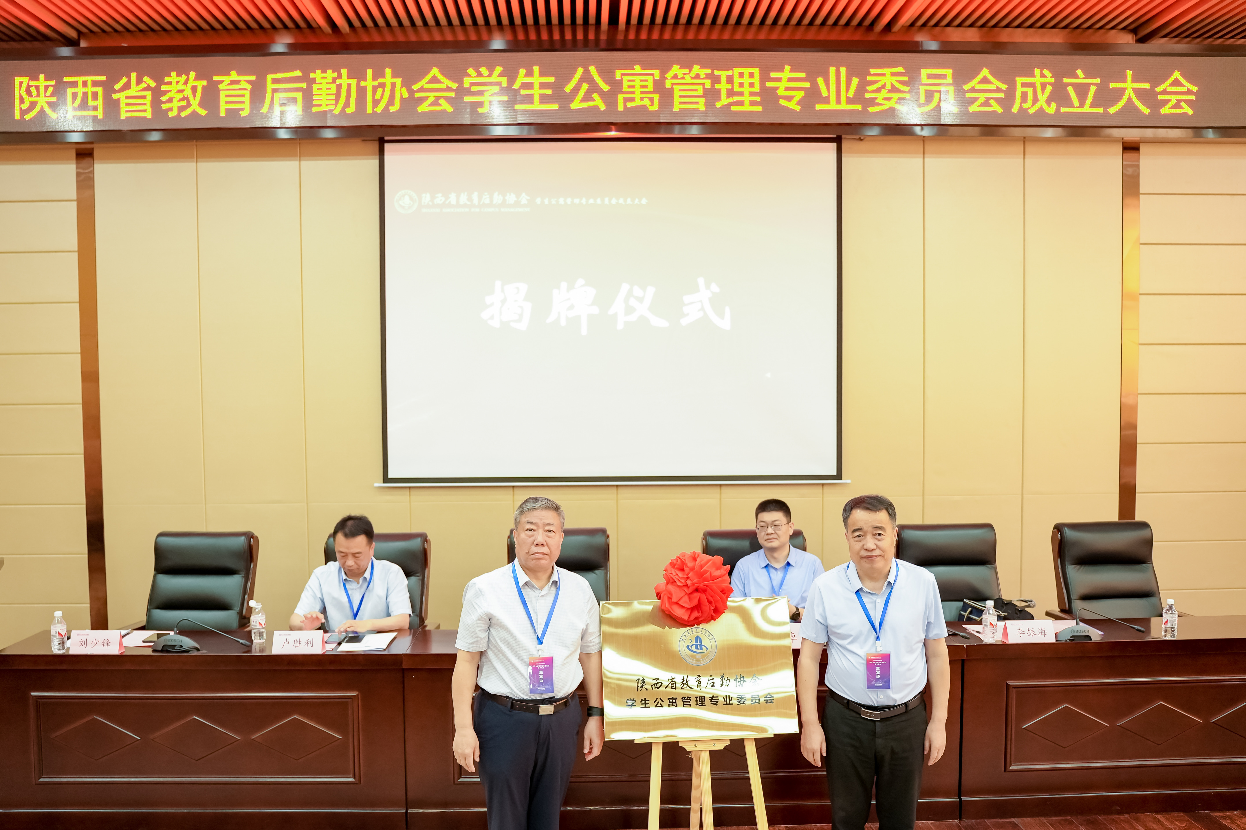 大会第二阶段,大会宣读了陕西省教育后勤协会学生公寓管理专业委员会一届一次常务委员会会议决议。张玉明、李振海共同为学生公寓管理专业委员会揭牌。张玉明会长为新当选的主任、副主任、秘书长颁发证书。公寓管理专业委员会主任李振海为副秘书长颁发聘书。