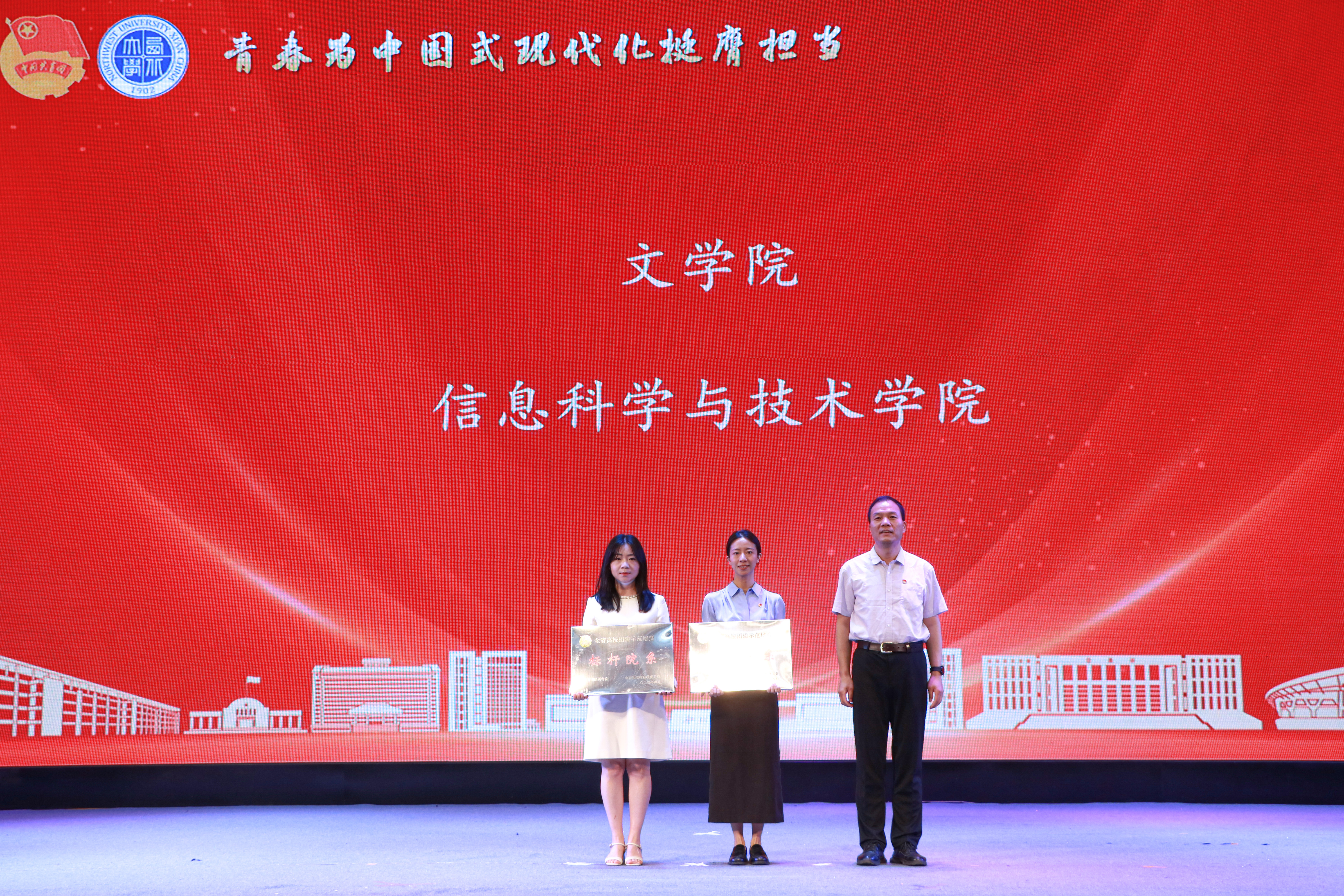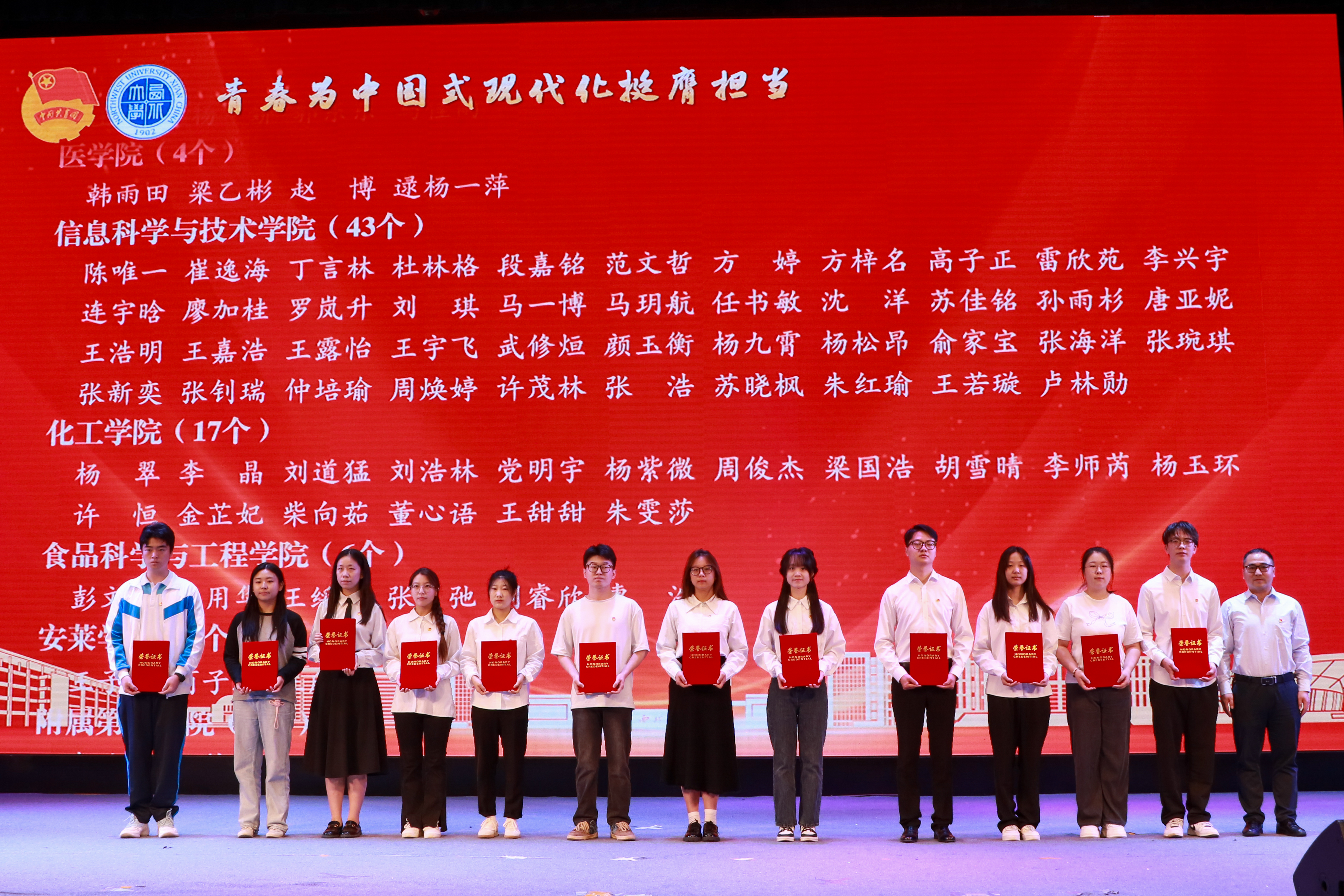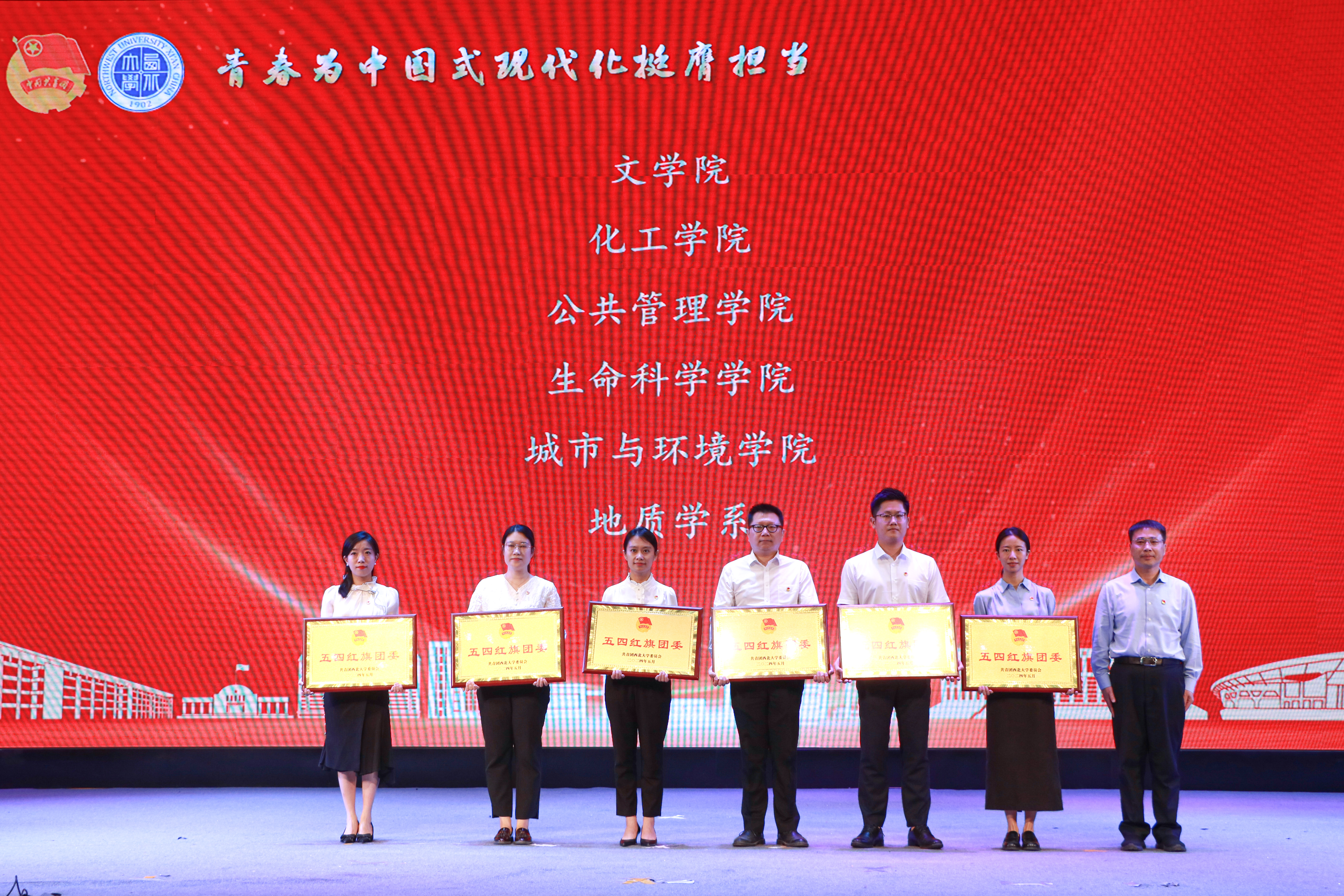 大会上,与会领导分别为“五四红旗团委”、“全省高校团建示范培育标杆院系”、“优秀专职团干部”、“一院一品共青团工作单项奖”和优秀共青团员、优秀学生团干部、十佳团支部书记、五星级团支部、活力团支部、2023年度“陕西省学联学生会先进工作个人”、“最西大”学子奖、2023-2024年度陕西省大学生自强之星(科创团队)、省级暑假社会实践获奖集体和个人颁发奖牌和证书。