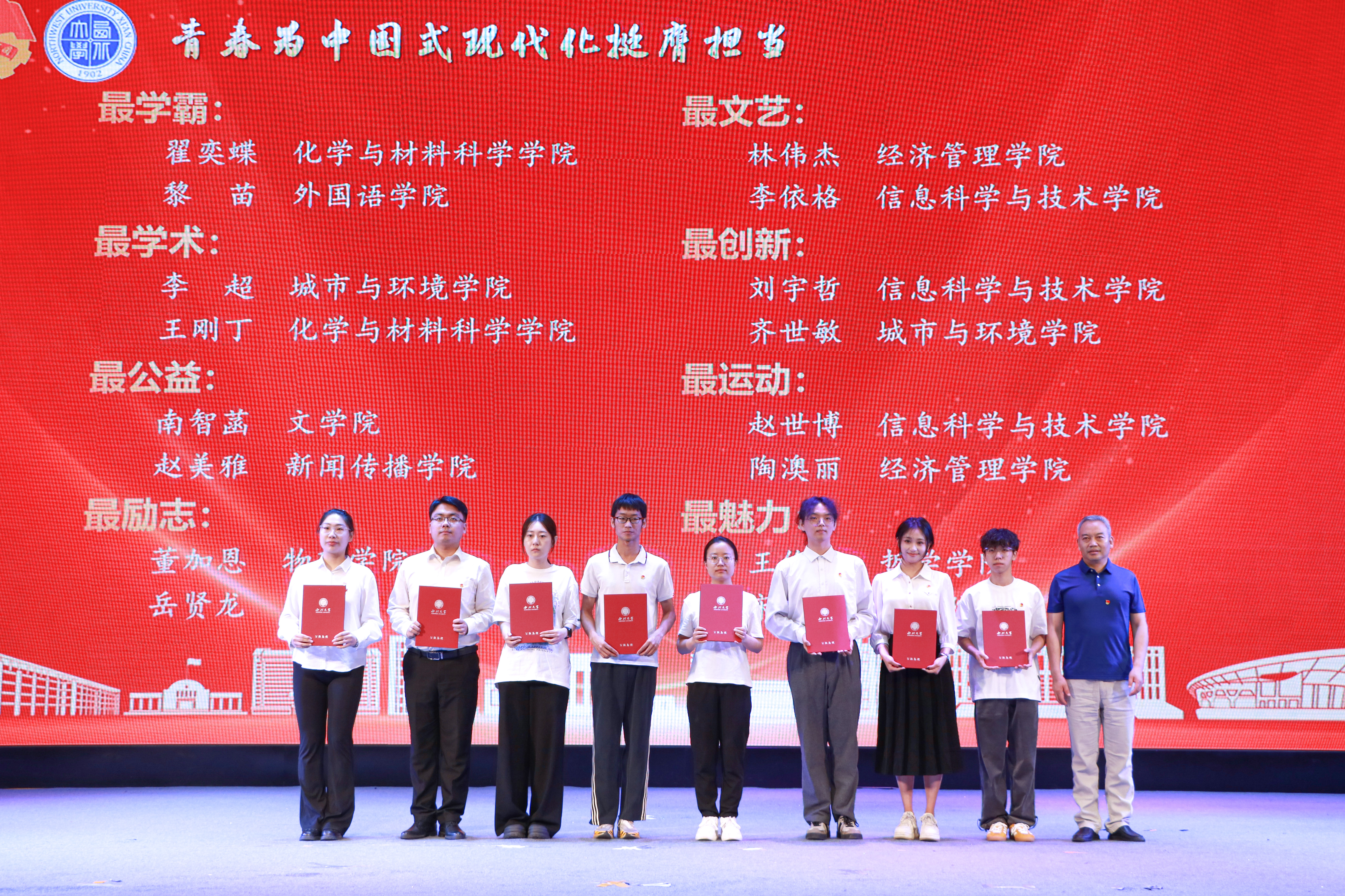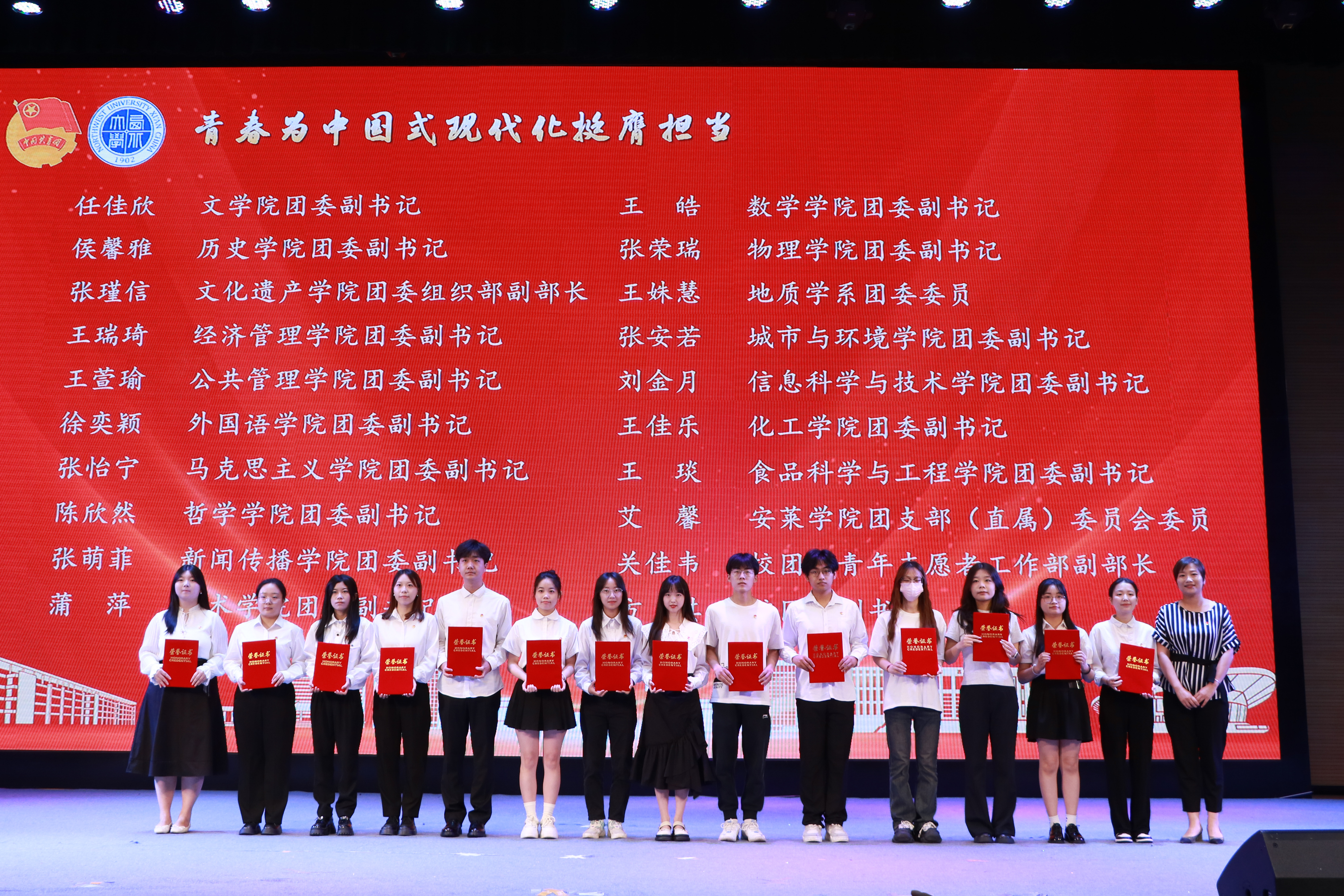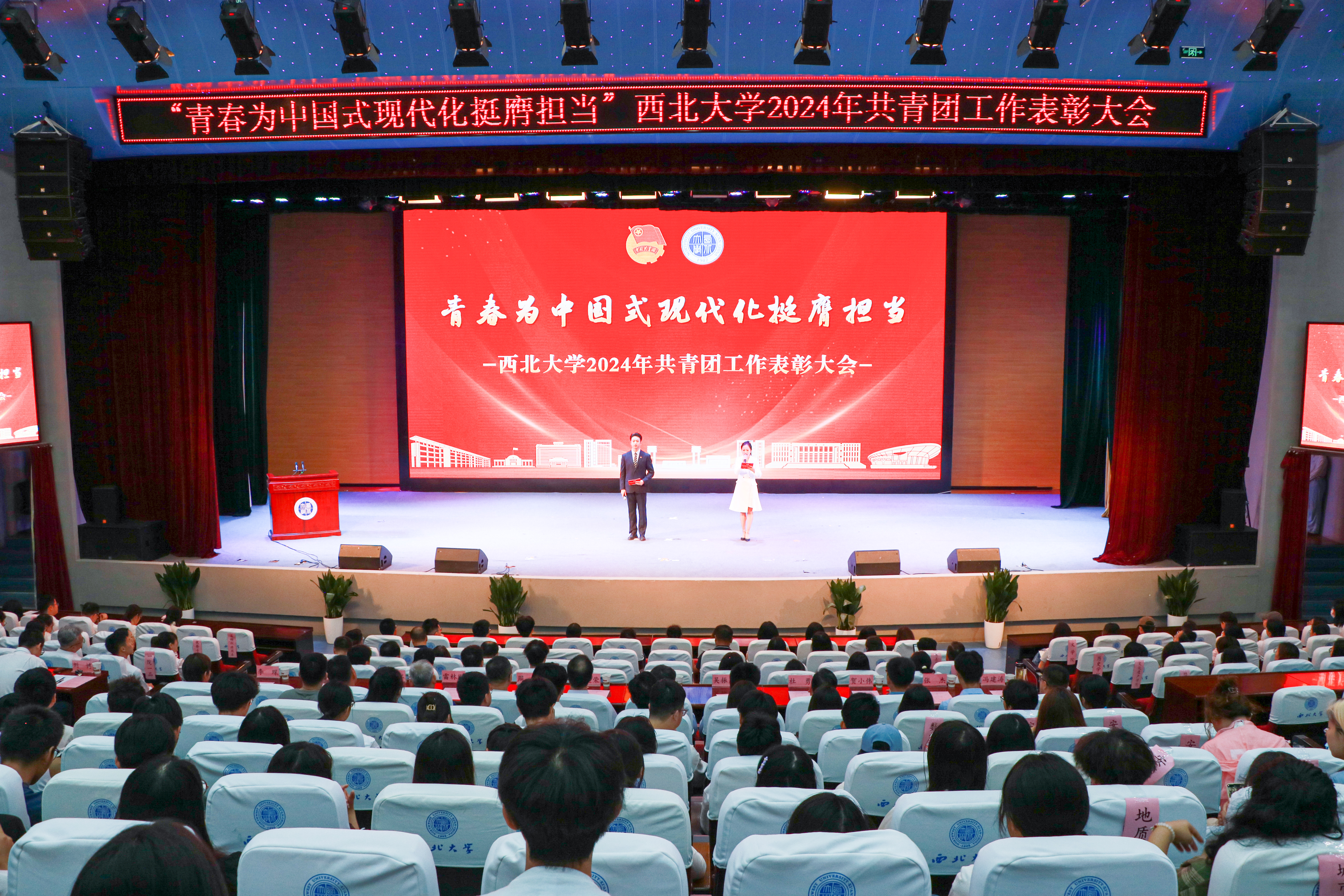 大会上,与会领导分别为“五四红旗团委”、“全省高校团建示范培育标杆院系”、“优秀专职团干部”、“一院一品共青团工作单项奖”和优秀共青团员、优秀学生团干部、十佳团支部书记、五星级团支部、活力团支部、2023年度“陕西省学联学生会先进工作个人”、“最西大”学子奖、2023-2024年度陕西省大学生自强之星(科创团队)、省级暑假社会实践获奖集体和个人颁发奖牌和证书。