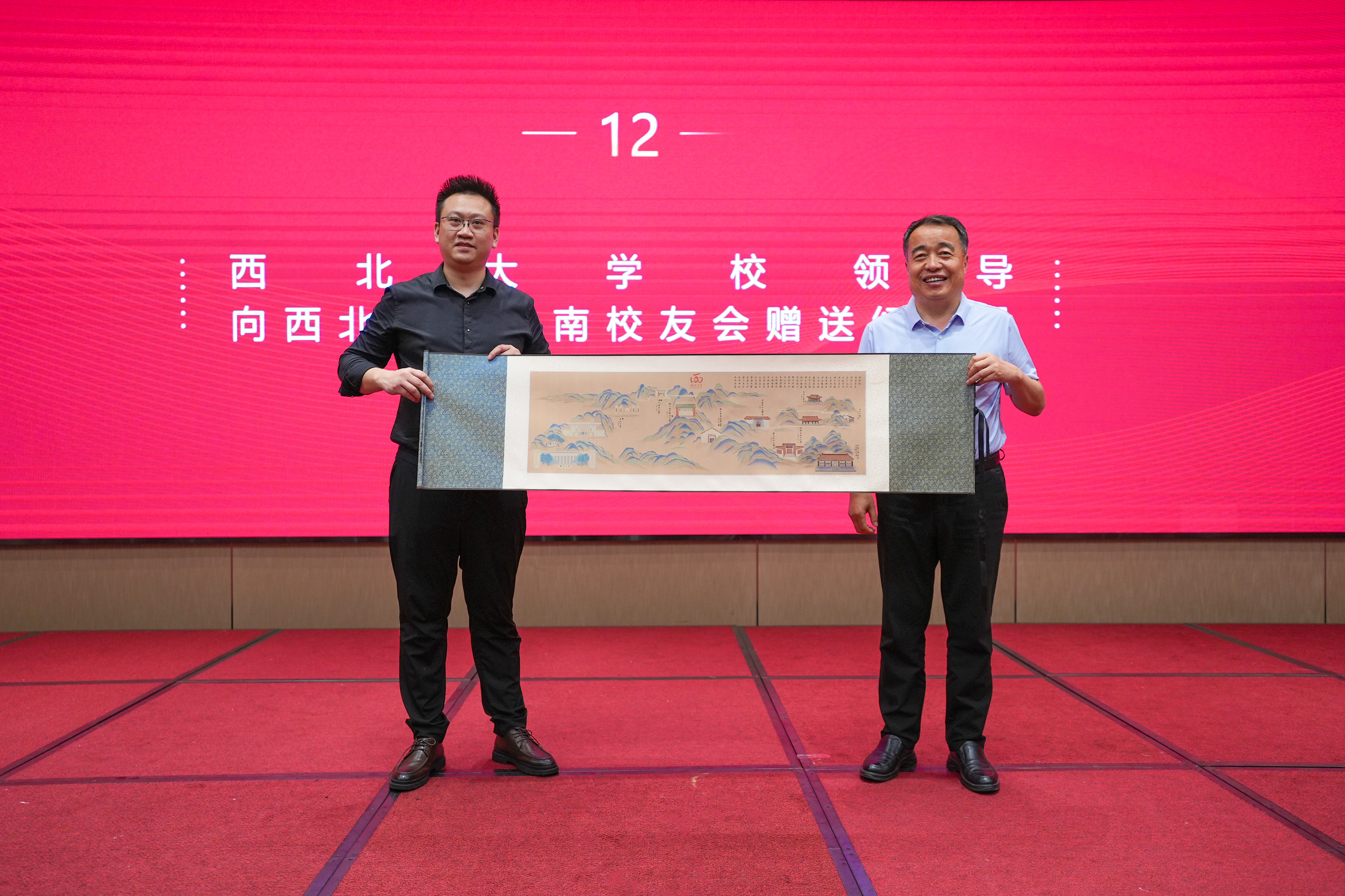 李振海代表学校向湖南校友会赠送《母校铭》卷轴。