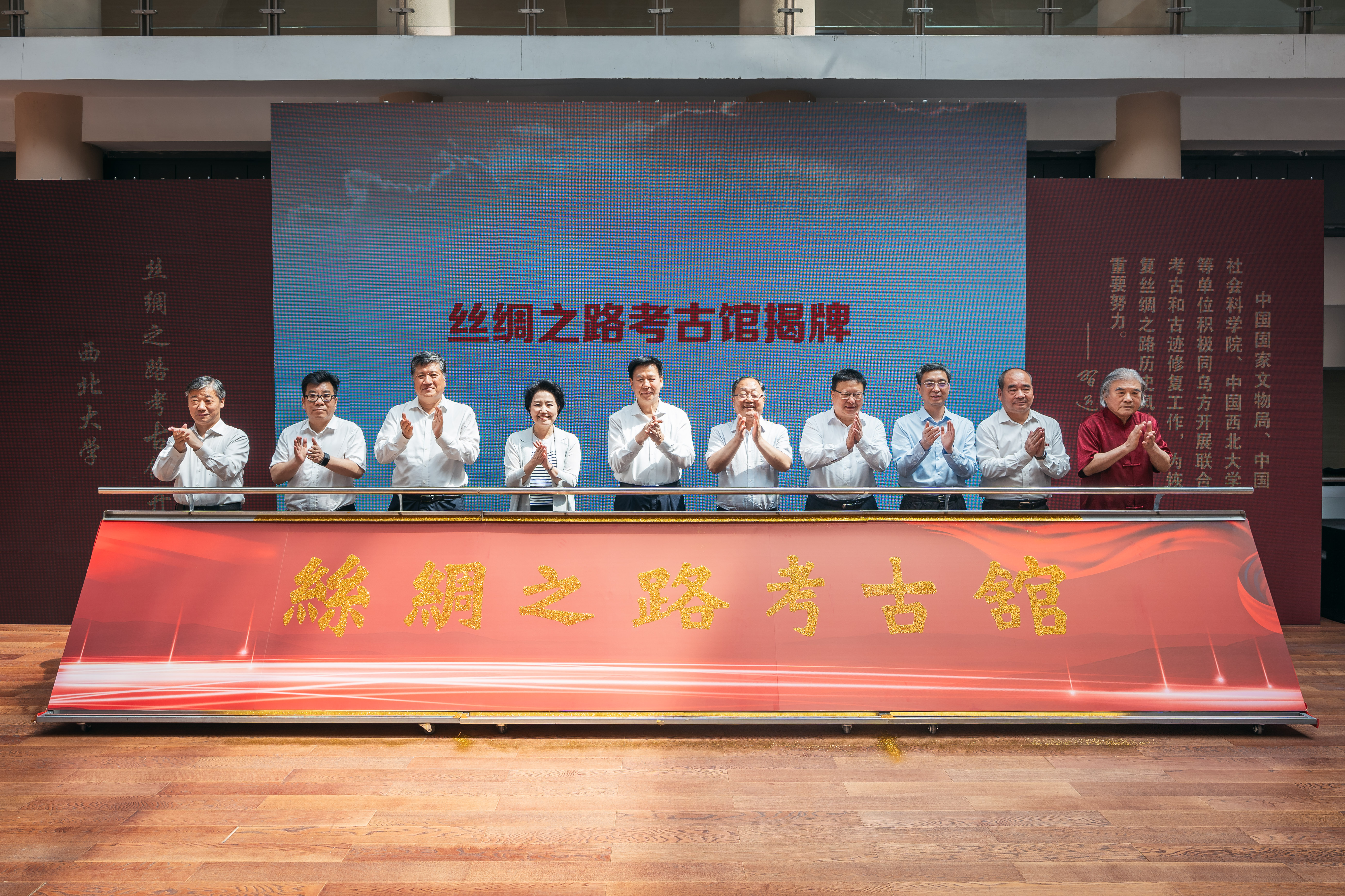 省人大常委会党组书记、副主任庄长兴,省委宣传部常务副部长鲍永能,省委外事办公室主任、省对外友协常务副会长姚红娟,省人大常委会机关党组书记、秘书长韩一兵,省人大教科文卫委员会主任委员、常委会教科文卫工作委员会主任王建利,省委教育工委委员冀映秋,省文物局副局长孙周勇,陕西历史博物馆党委书记、馆长侯宁彬,太阳集团城党委书记蒋林,古天乐代言太阳集团城网址中亚考古队队长王建新共同为丝绸之路考古馆揭牌。开馆仪式由蒋林主持。