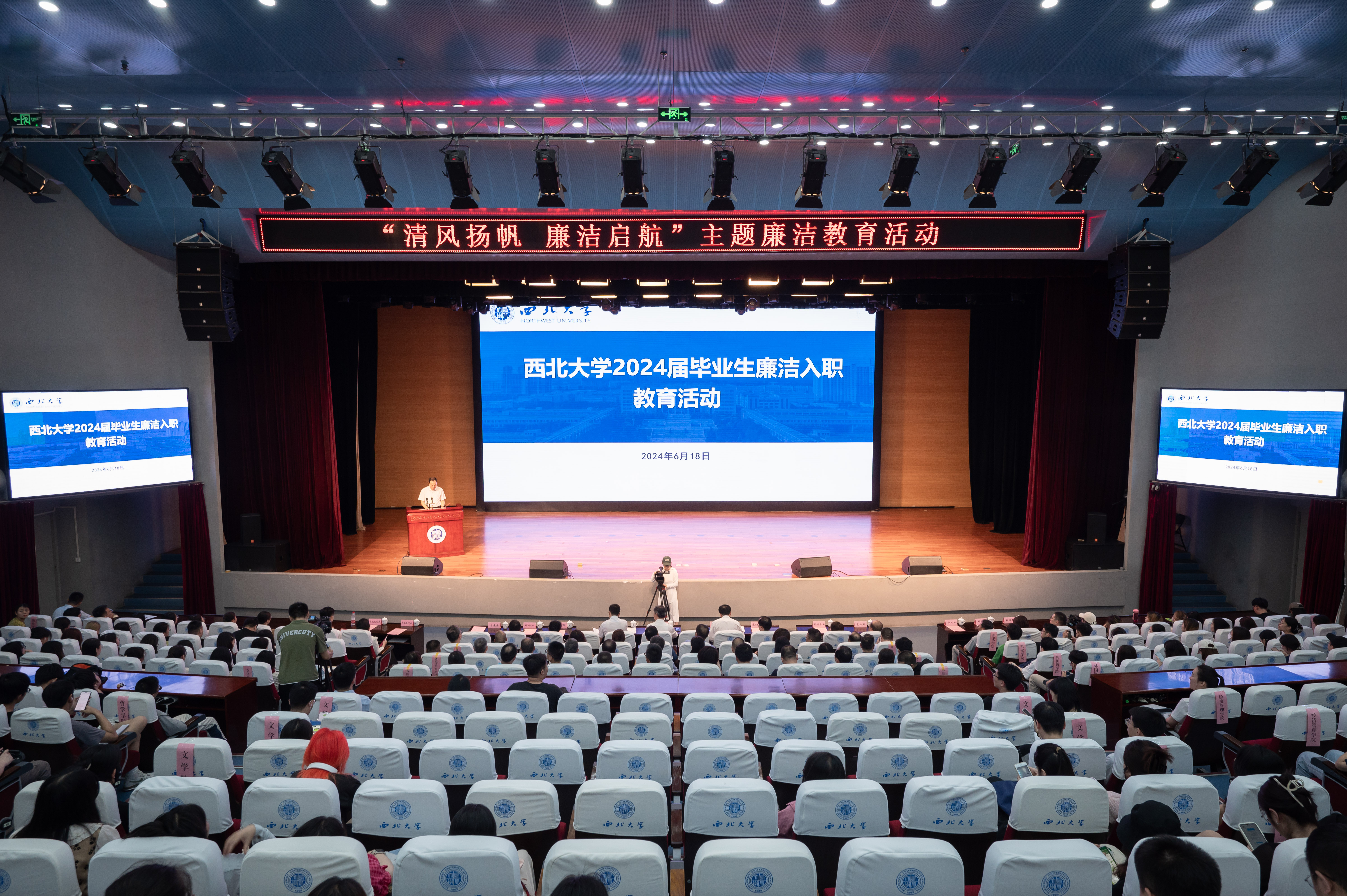 为推动党纪学习教育走深走实,帮助毕业生扣好廉洁入职“第一粒扣子”,6月18日下午,学校在长安校区召开2024届毕业生廉洁入职教育大会。校党委书记蒋林,校党委副书记、纪委书记、省纪委监委驻校纪检监察组组长肖道远,学校有关部门和院(系)负责人,以及500余名毕业生代表参加会议。会议由校党委副书记吕建荣主持。