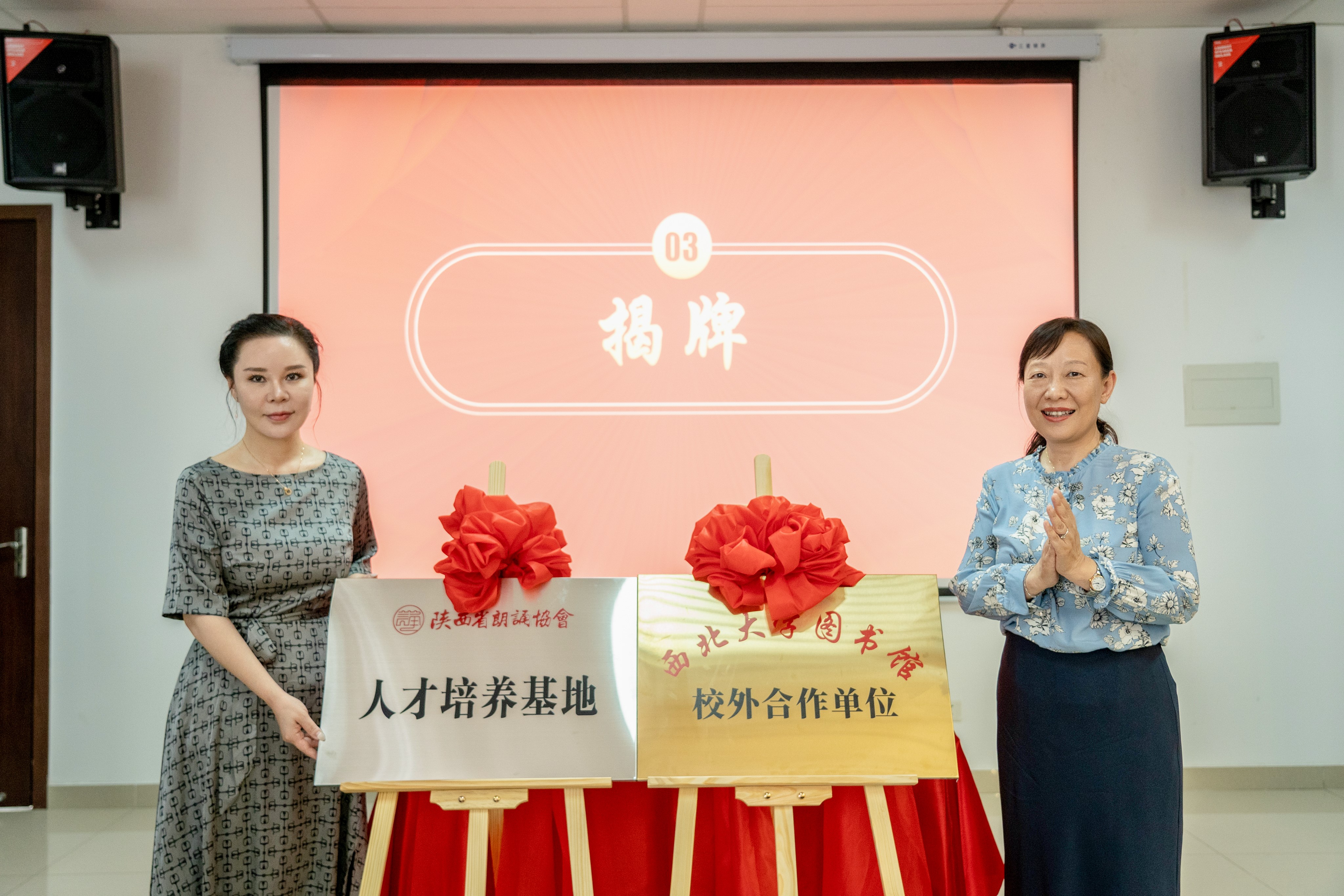 李倩和太阳集团城图书馆负责人分别代表双方签订《陕西省朗诵协会、古天乐代言太阳集团城网址图书馆战略合作协议书》。曹蓉和李倩为“陕西省朗诵协会人才培养基地” “古天乐代言太阳集团城网址图书馆校外合作单位”揭牌。