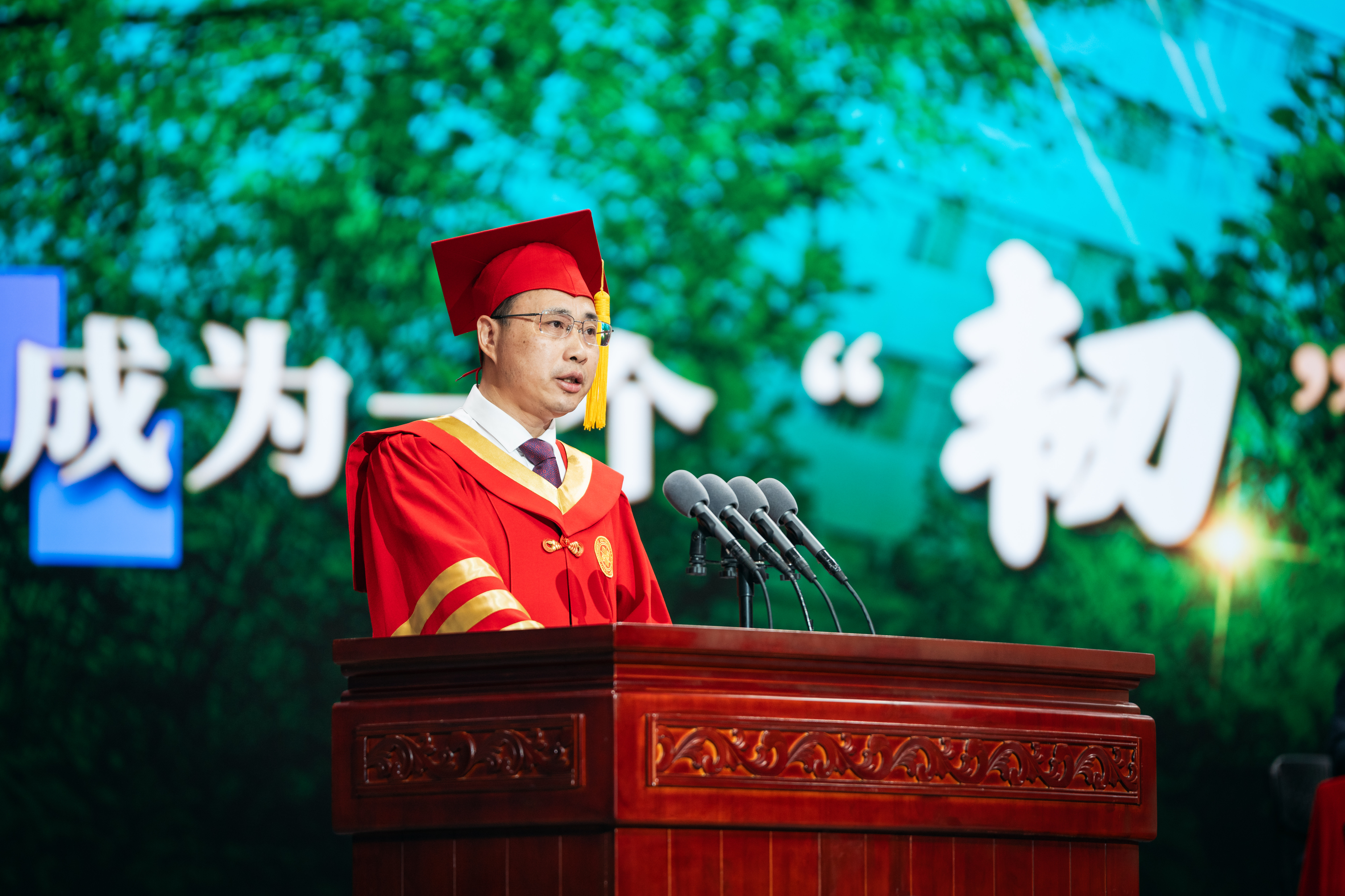 他殷殷寄语广大毕业生:要“化欲望为志气”,为热爱而全力奔跑,不害怕试错,敢于去探索、去尝试、去经历、去发现;要“化内耗为内省”,接纳不完美的自己,不逃避、不厌弃、不停留,汇聚“韧”的勇气,完成自我超越;要“化执念为执着”,将理想融入到人生每一个当下的瞬间,在高度专注投入中自然平顺地实现目标、达成所愿;要“化刚性为弹性”,习得高复原力和高心理韧性,激发自身体内潜能,有效增强与世界的连接感。他最后祝愿每一位同学都能成长为一个“韧”的人,坚信每一个“韧”的西大人,都会被看见。