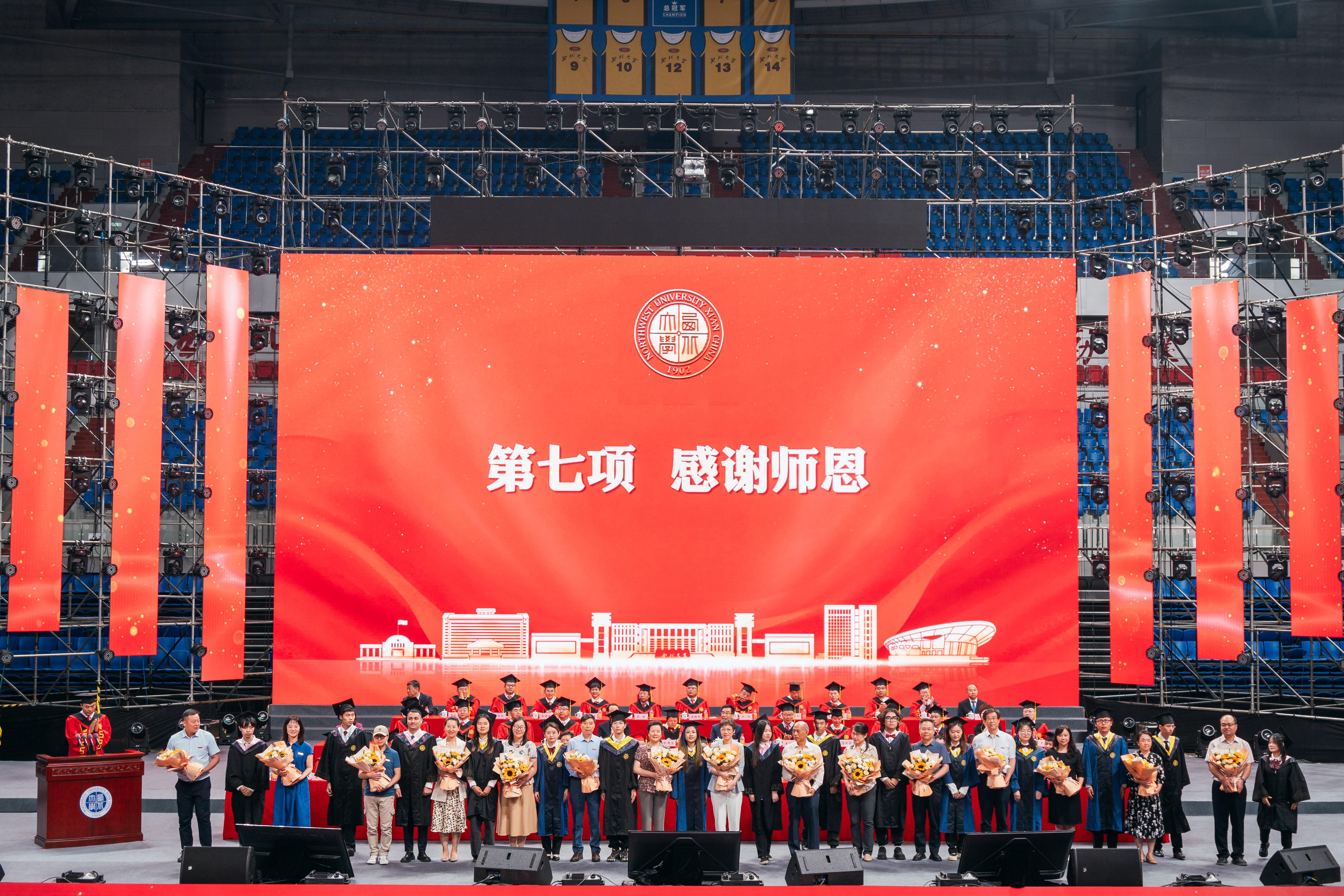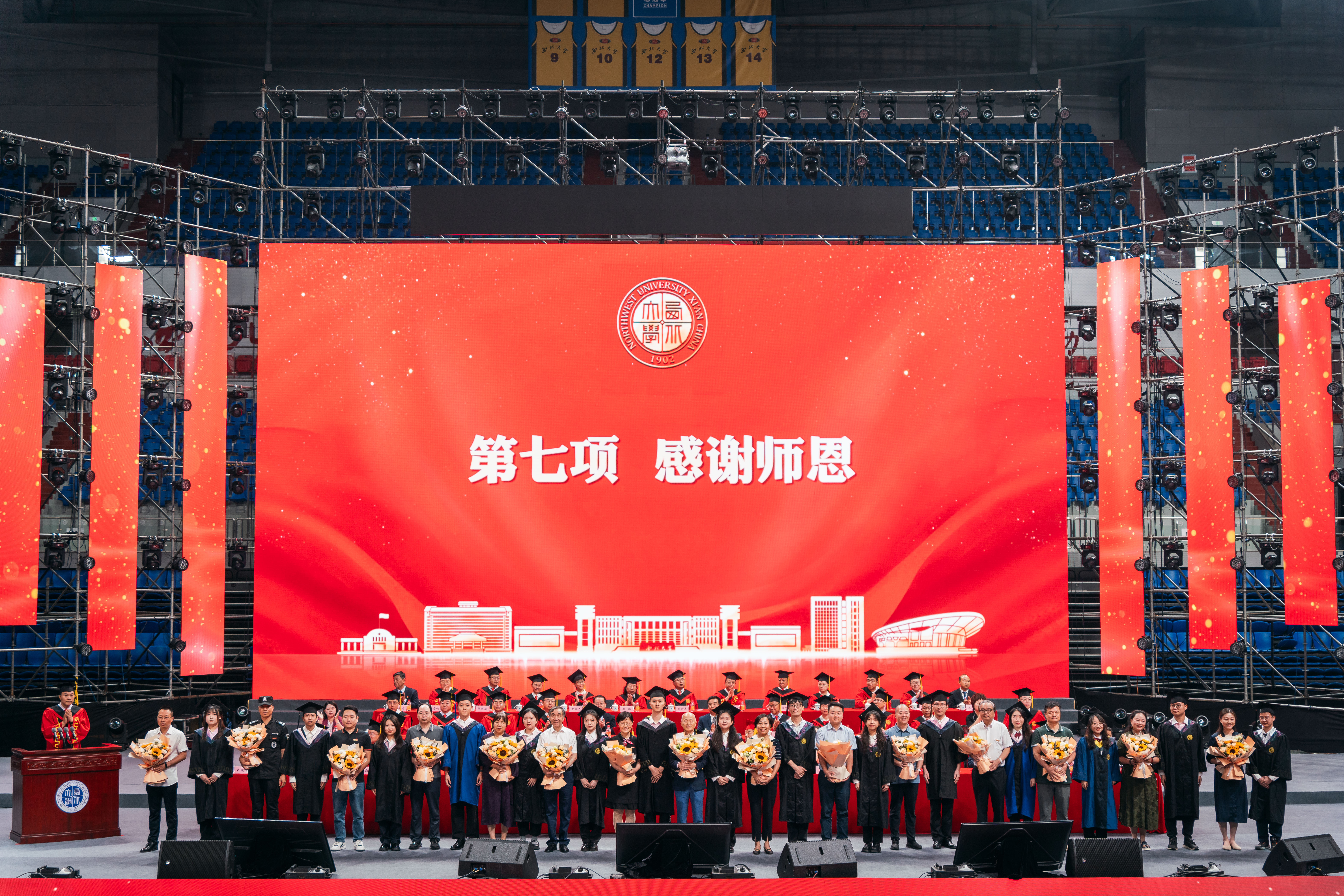 毕业生代表为辛勤付出的老师们深躬、献花,感谢他们的谆谆教诲与一路陪伴。与会领导为毕业生赠送蓝田玉印。