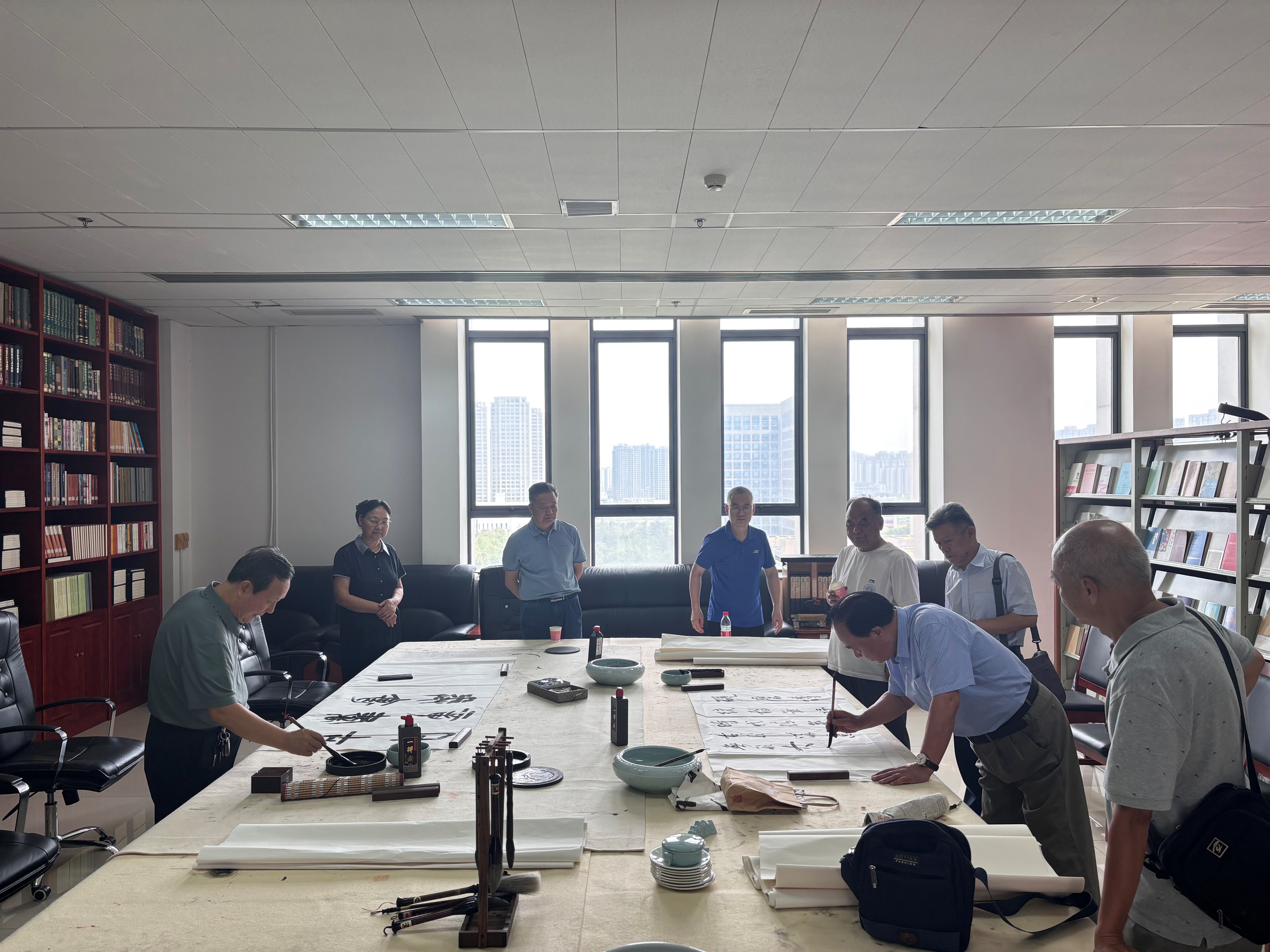 李志慧、骞平义、陈西鸾、李子州、柏一林、丁晶燕、霍国庆、孙亚军等书法爱好者和校友教师参加捐赠仪式。仪式结束后,全体人员在图书馆书画研究会创作室进行书画笔会与座谈。