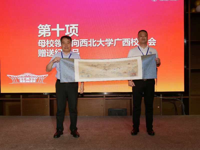 广西双一流人才交流联合会负责人黄诗予,湖南校友会会长刘广分别代表兄弟高校校友会和地方校友会致辞。李振海代表学校向广西校友会赠送纪念品,黄诗予代表兄弟高校校友会向广西校友会赠送纪念品。