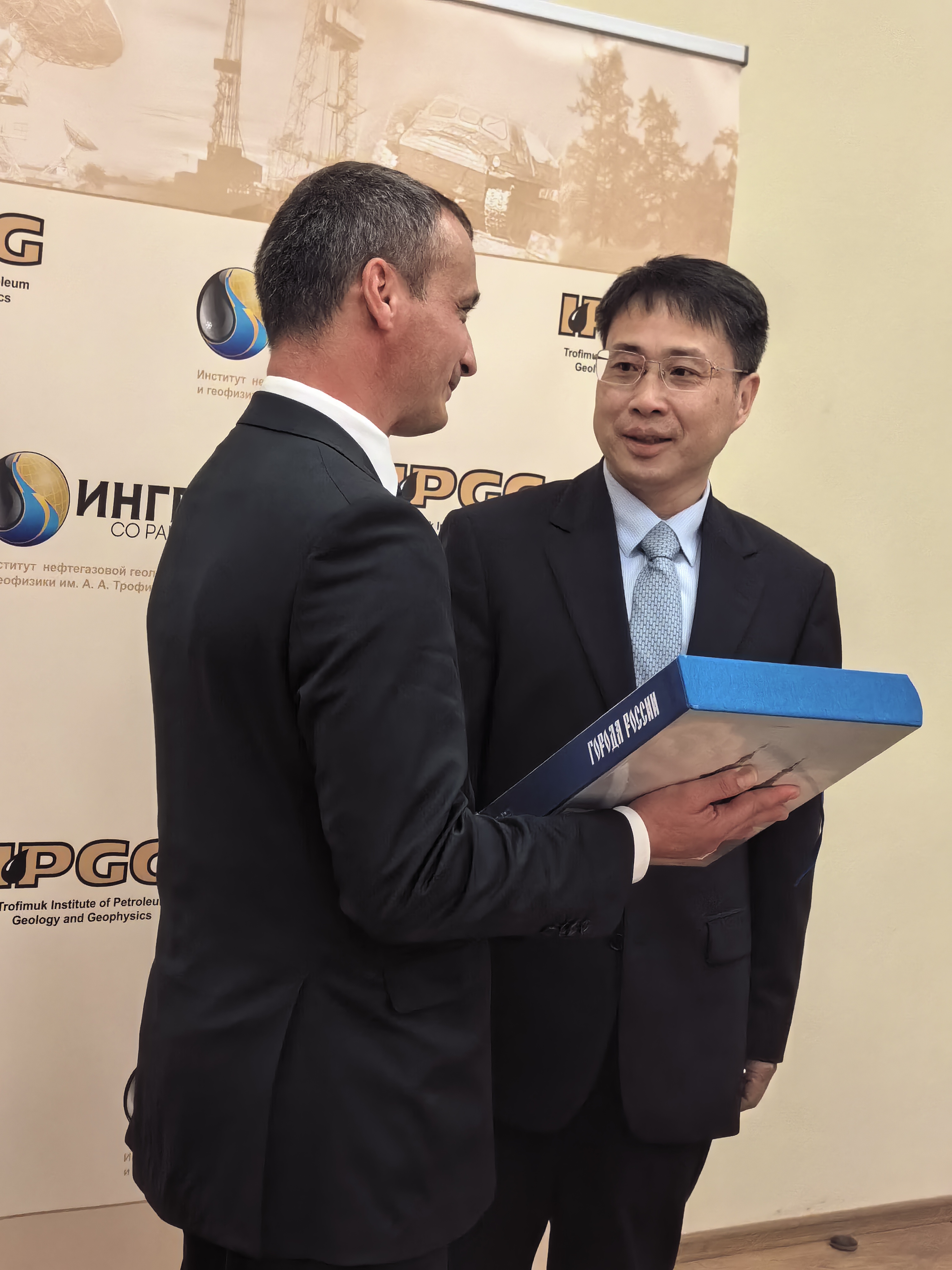 孙庆伟与俄罗斯科学院西伯利亚分院特罗菲穆克石油地质与地球物理研究所所长格林斯基赫交流