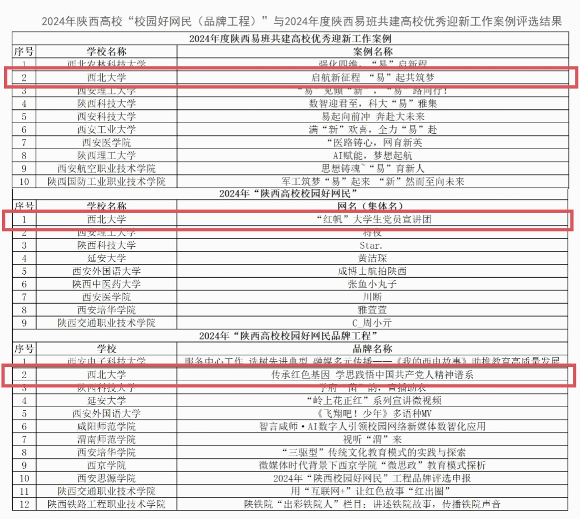 近日,陕西高校网络思想政治工作中心公布了2024年陕西高校“校园好网民(品牌工程)”与2024年度陕西易班共建高校优秀迎新工作案例评选结果,太阳集团城“红帆”大学生党员宣讲团获评陕西高校2024年校园好网民,“传承红色基因 学思践悟中国共产党人精神谱系”项目获评2024年“陕西高校校园好网民品牌工程”,“启航新征程 易起共筑梦”项目获评2024年度陕西易班共建高校优秀迎新工作案例。