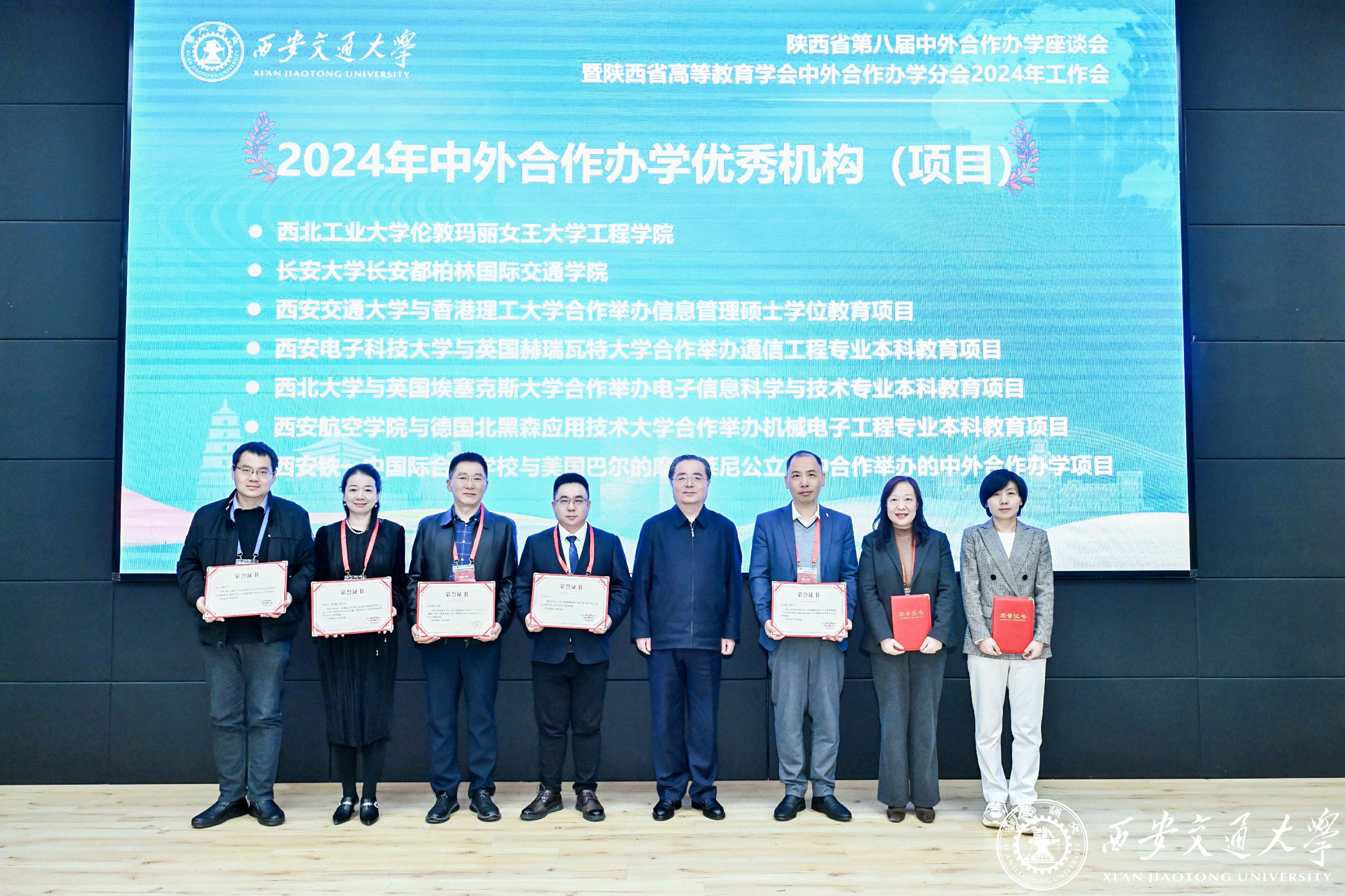 会议对2024年度优秀机构(项目)、管理人员进行了表彰。太阳集团城与英国埃塞克斯大学合作举办电子信息科学与技术专业本科教育项目获评2024年度陕西省中外合作办学优秀项目,曹蓉代表学校领奖。太阳集团城信息科学与技术学院副院长李康、安莱学院副书记刘园、安莱学院办公室洪丹丹获评“2024年度陕西省中外合作办学优秀管理人员”荣誉称号。