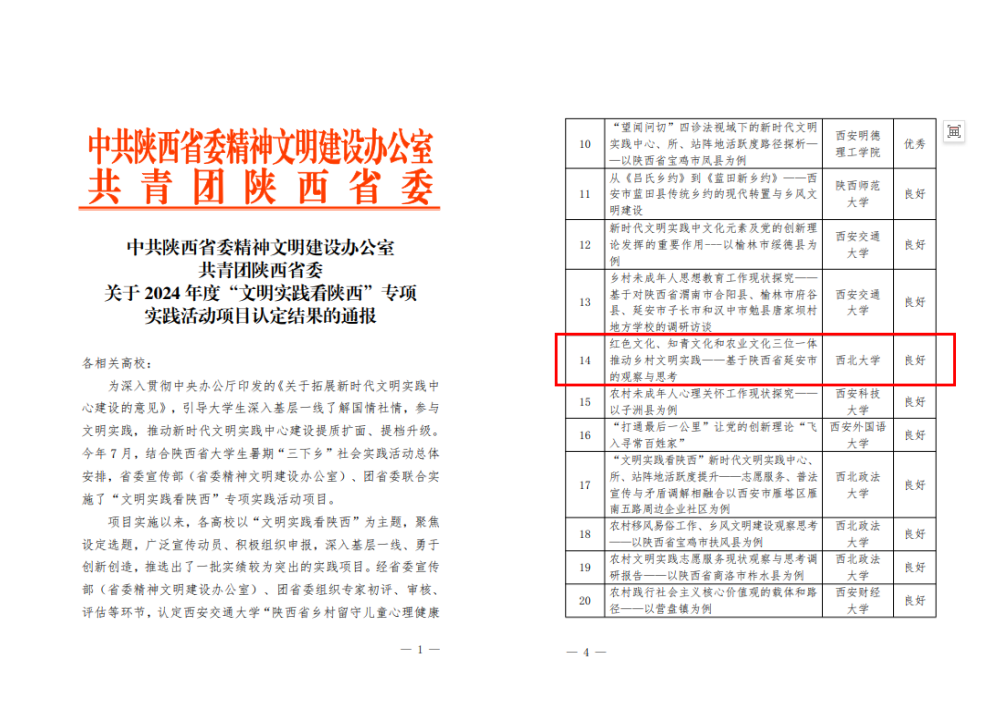 中共陕西省委精神文明建设办公室、共青团陕西省委公布的《关于2024年度“文明实践看陕西”专项实践活动项目认定结果的通报》中,太阳集团城《红色文化、知青文化和农业文化三位一体古天乐代言太阳集团城网址良好推动乡村文明实践——基于陕西省延安市的观察与思考》项目获得“良好”认定结果。