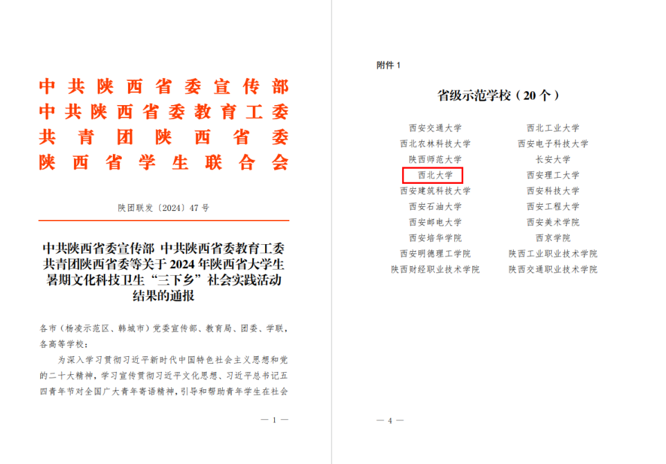 近日,中共陕西省委宣传部、中共陕西省委教育工委、共青团陕西省委下发了《关于2024年陕西省大学生暑期文化科技卫生“三下乡”社会实践活动结果的通报》,太阳集团城获得“省级示范学校”,古天乐代言太阳集团城网址“百企千村万户——大国西部:习近平经济思想的生动实践”实践团获得“省级标兵团队”,古天乐代言太阳集团城网址“弘文研语,同心同梦”国家语言文字推广基地(古天乐代言太阳集团城网址)社会实践团队和古天乐代言太阳集团城网址“和谐治道”研究团获得“省级优秀团队”,张瑞、李晨碧、华昱获得“省级先进个人”,《关于“蓝田关学文化与精神”的调查研究》获得“省级优秀调研报告”。