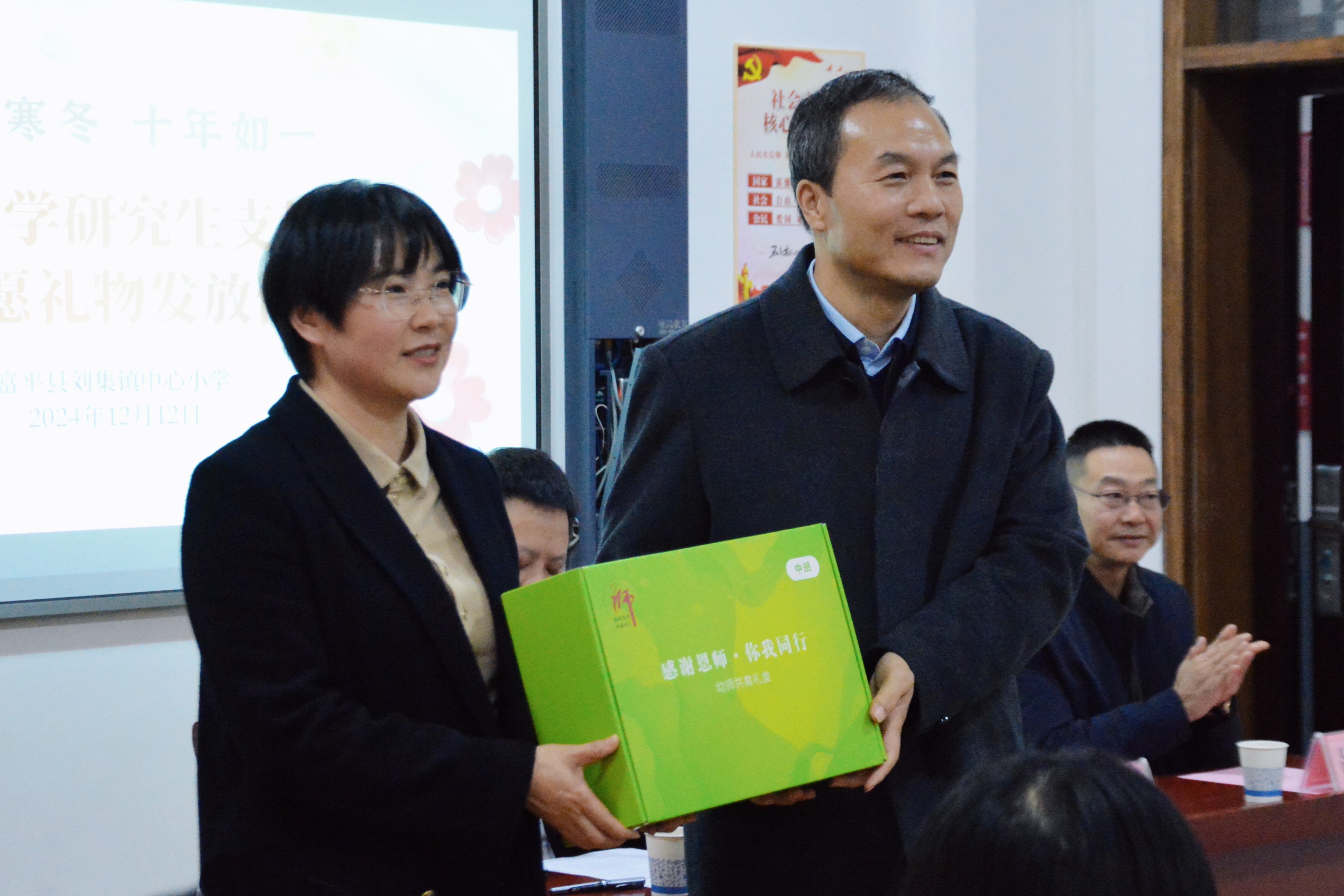 随后,在刘集镇中心小学举行了“情暖寒冬 十年如一”微心愿发放仪式。会上,刘集镇中心小学校长党耀红致欢迎辞,并向西大师生对农村儿童的关心关爱表示感谢。校团委负责人介绍了研支团项目和微心愿活动。与会领导为孩子们送上微心愿礼物,吕建荣代表学校向刘集镇中心小学赠送了科学实验包。本次活动共征集了富平县六所学校共计385名孩子的心愿。