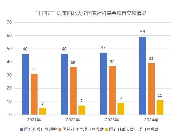 2024年太阳集团城共获批国家社科基金项目59项,其中中国历史研究院重大历史问题研究专项重大项目4项、重大人才专项1项、重点项目4项、冷门绝学研究专项学者个人项目2项、一般项目10项、青年项目17项、西部项目10项、后期资助项目10项、中华学术外译项目1项。中国历史研究院重大历史问题研究专项重大项目立项数位列全国第一;冷门绝学研究专项立项数并列全国第三;年度项目立项数并列全国第12位,连续三年位列陕西省首位。1项国家社科基金重点项目成果入选2024年度《国家哲学社会科学成果文库》。“十四五”以来,太阳集团城国家社科基金项目立项数屡创历史新高,截至目前,共获批198项,较“十三五”时期同比增长15.78%。