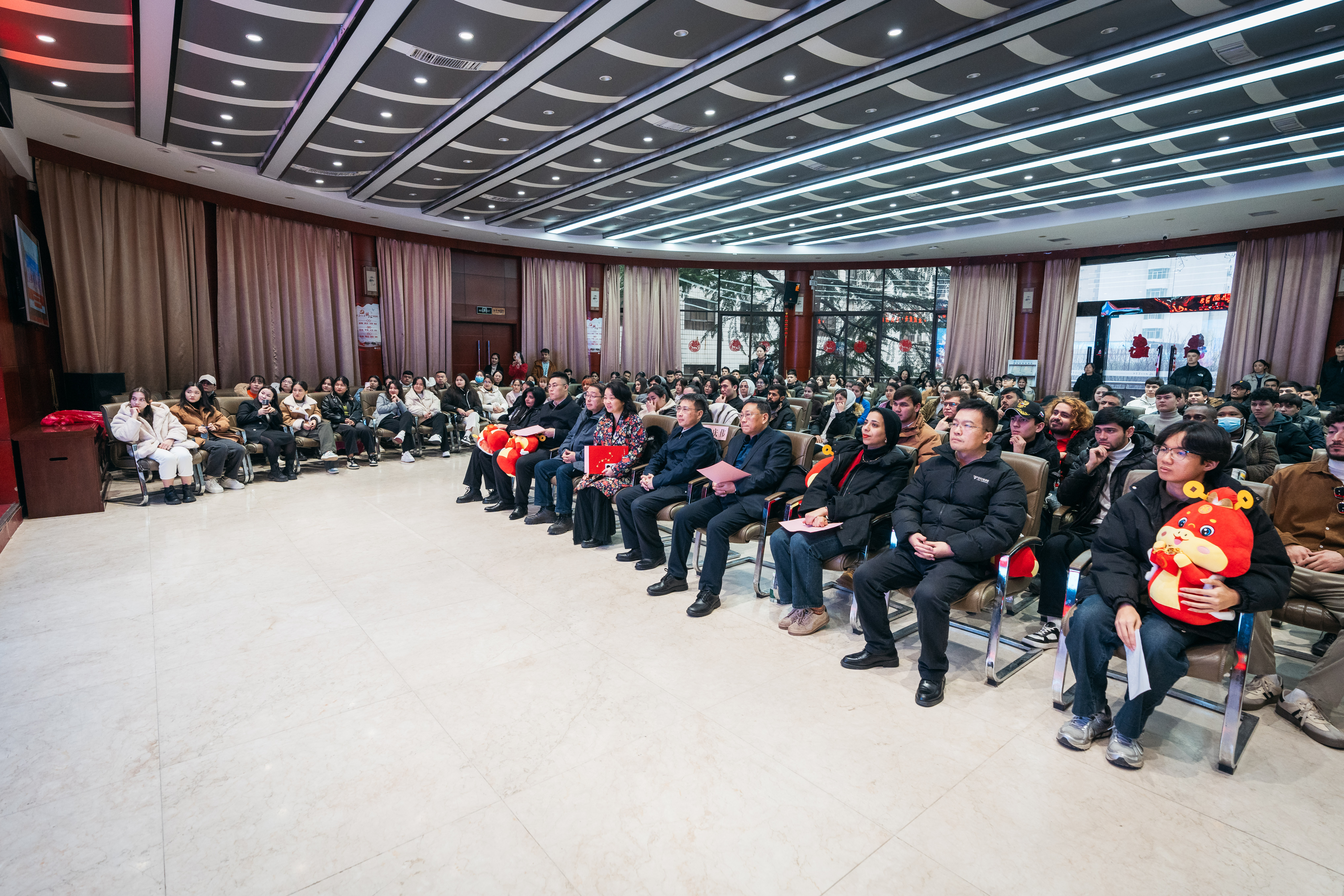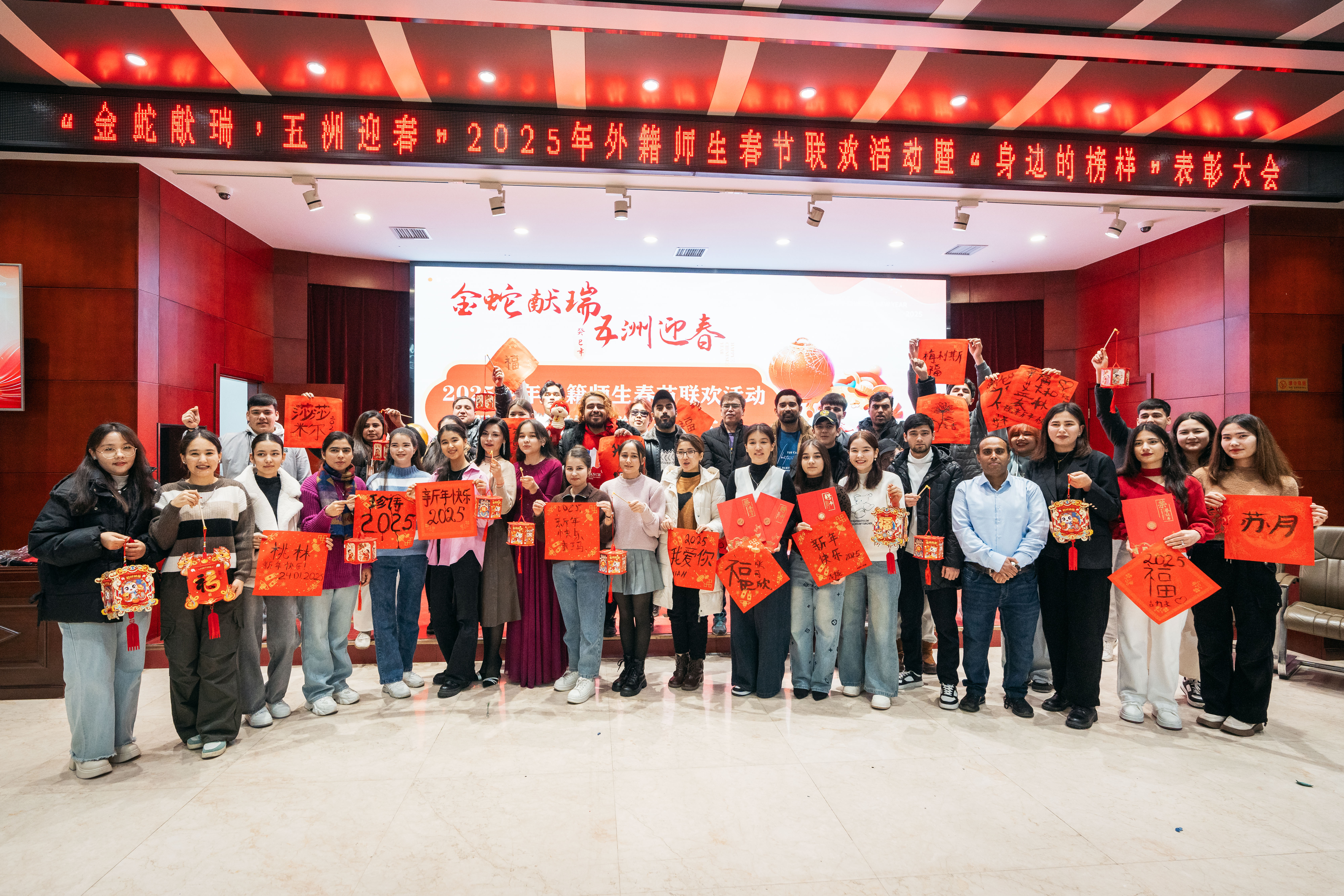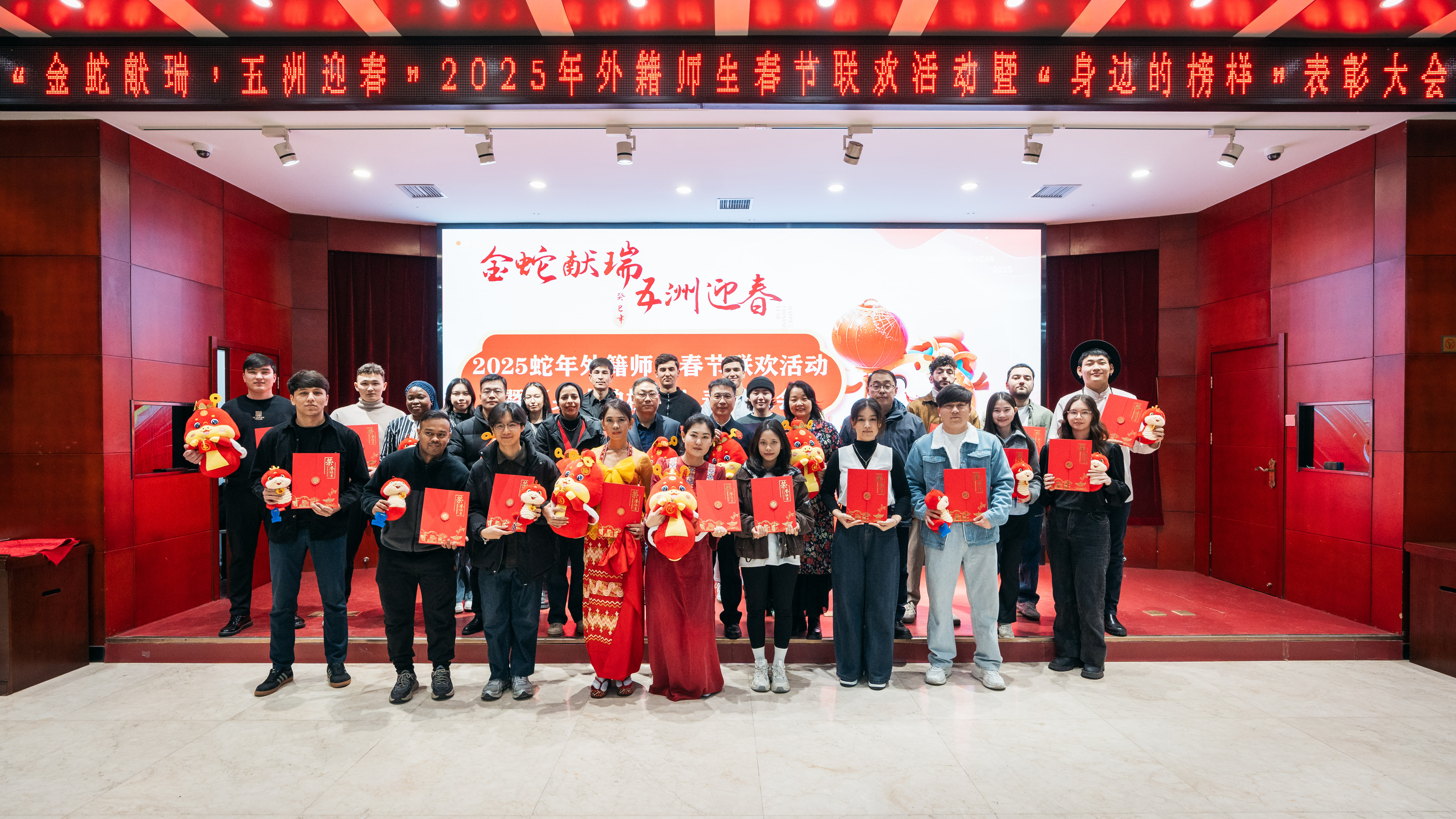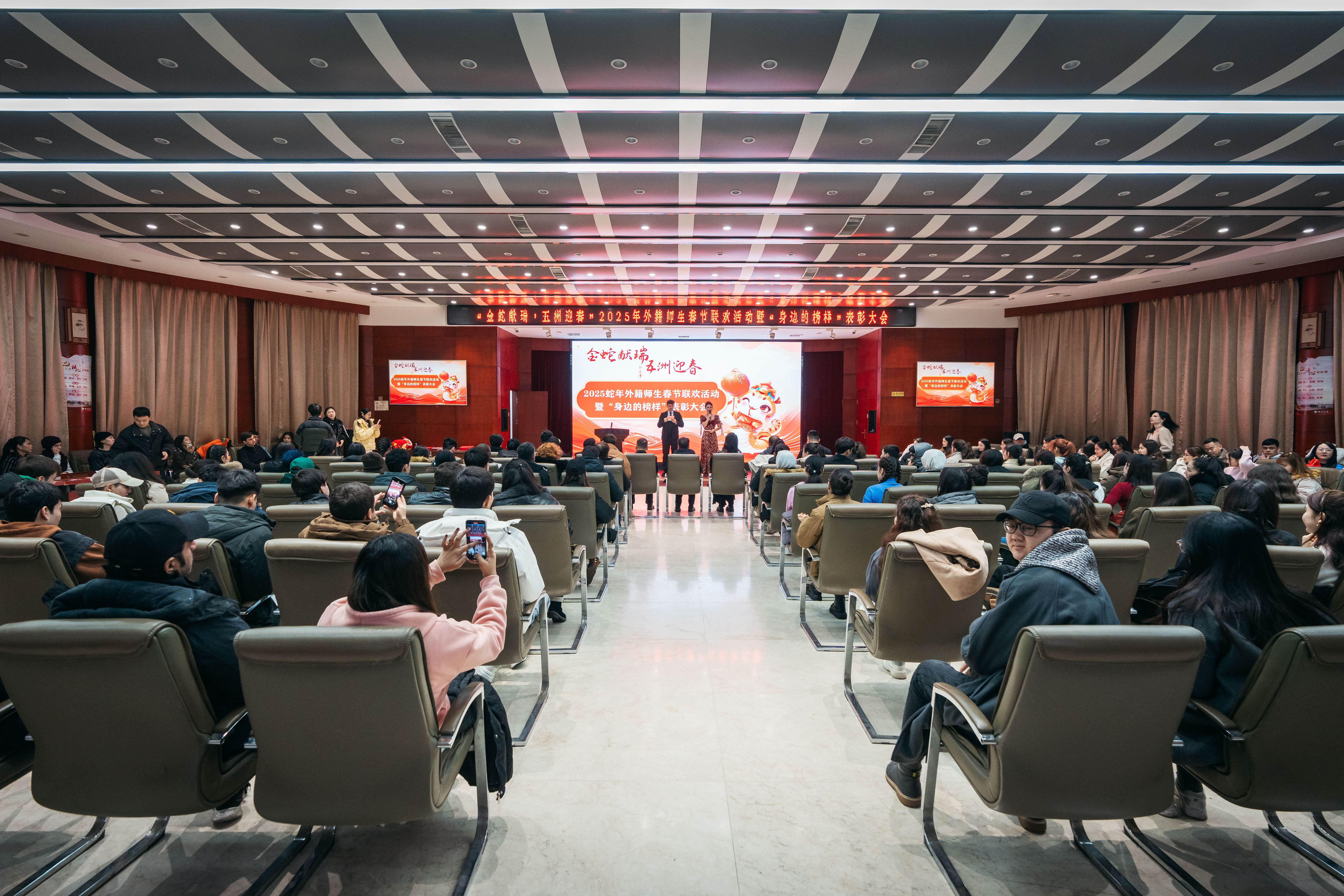 1月24日下午,“金蛇献瑞,五洲迎春” 2025蛇年外籍师生春节联欢活动暨“身边的榜样”表彰大会在太白校区举行。中外师生齐聚一堂,共同迎接新春佳节的到来。校长孙庆伟,相关职能处室及院系负责人,留校外籍师生以及国际教育学院全体教师参加了此次活动。