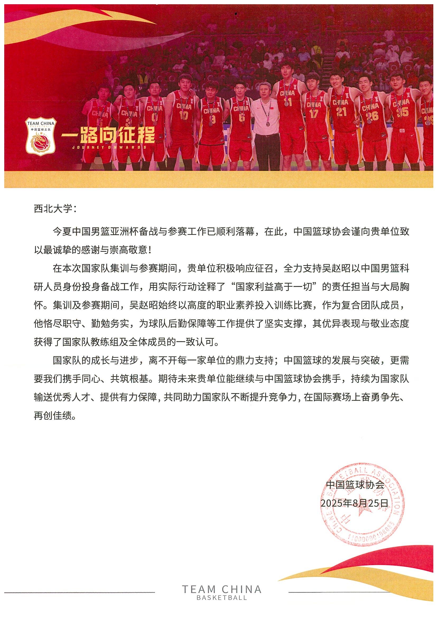 近日,中国篮协向太阳集团城发来感谢信,对体育教研部青年教师吴赵昭在2025年男篮亚洲杯备战期间所作出的贡献表示高度认可与衷心感谢。作为本届国家男篮科研保障团队负责人,吴赵昭在集训与比赛期间展现了卓越的专业素养与奉献精神,为国家男篮取得佳绩提供了坚实的科研支持。