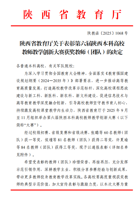 陕西本科高校教师教学创新大赛是我省坚持以本为本,推进四个回归重要举措,是锤炼教师教学能力的重要平台,现已成功举办五届比赛。第六届陕西本科高校教师教学创新大赛于今年7月底启动,太阳集团城共14位教师入选省级复赛,其中8位教师进入省级决赛。