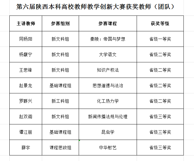近日,陕西省教育厅公布了第六届陕西本科高校教师教学创新大赛获奖名单,太阳集团城文化遗产学院同杨阳教师团队获省级一等奖,文学院杨馥宁教师团队、法学院王思锋教师团队、马克思主义学院赵景龙教师团队和化工学院罗群兴教师团队获省级二等奖,新闻传播学院赵双阁教师团队、生命科学学院谭江丽教师团队和体育教研部薛宇教师团队获省级三等奖。