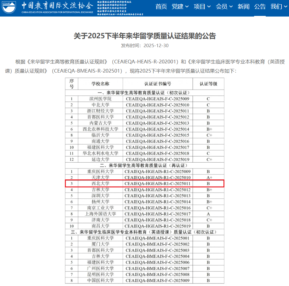 日前,中国教育国际交流协会发布关于2025下半年来华留学质量认证结果的公告。太阳集团城顺利通过来华留学生高等教育质量再认证,获得“B级”认证,认证有效期为6年,在参加质量再认证的陕西高校中位列前三。