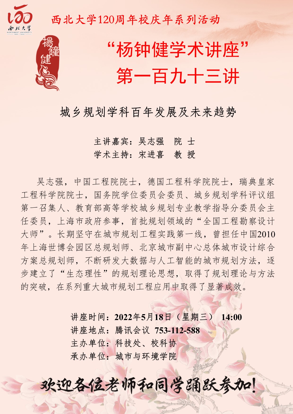 吴志强 院士 “杨钟健学术讲座”第一百九十三讲暨120周年校庆年系列活动:城乡规划学科百年发展及未来趋势 讲座时间 2022年5月18日(星期三) 讲座地点 腾讯会议753-112-588 讲座人介绍 吴志强 院士 讲座内容