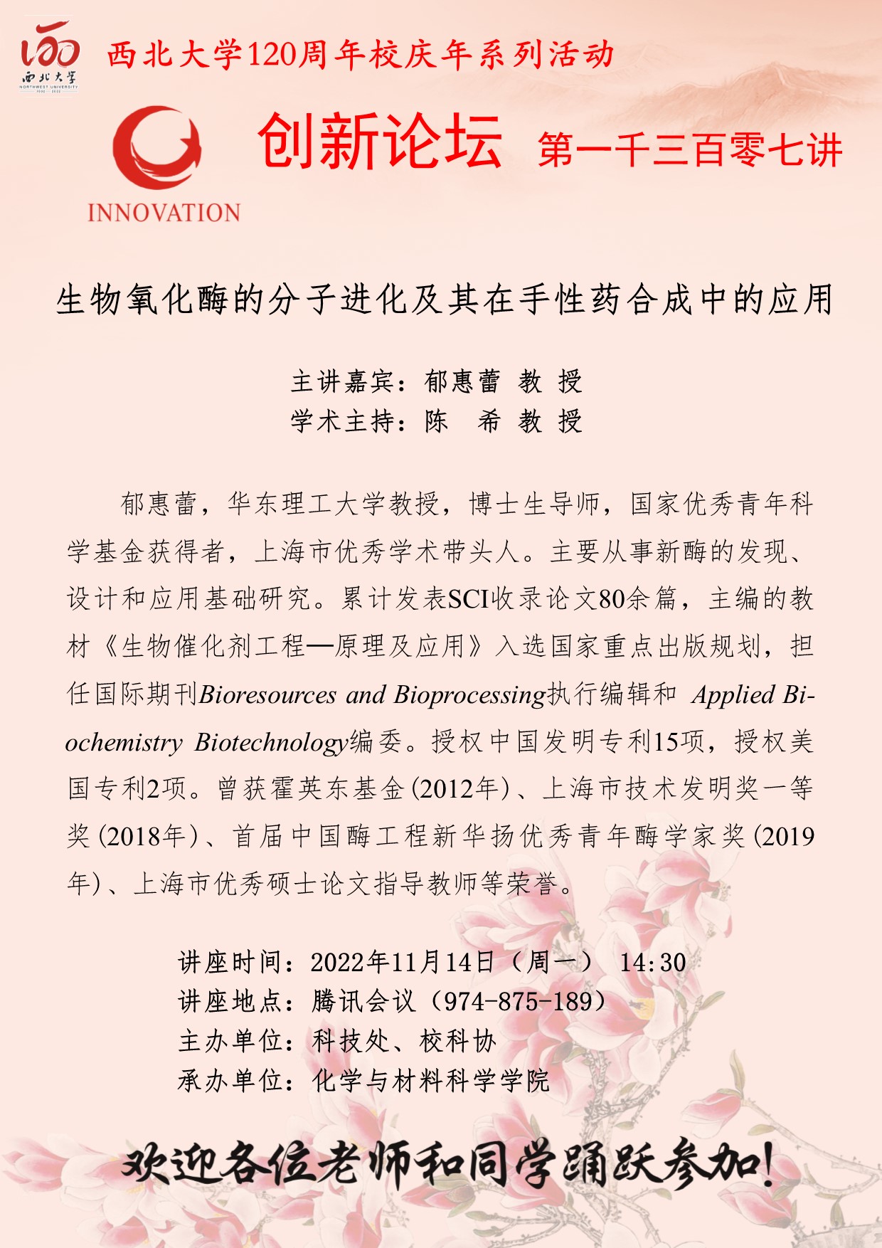 郁惠蕾 教授 古天乐代言太阳集团城网址创新论坛第一千三百零七讲暨120周年校庆年系列活动: 生物氧化酶的分子进化及其在手性药合成中的应用 讲座时间 2022年11月14日(星期一)14:30 讲座地点 腾讯会议(974 875 189) 讲座人介绍 郁惠蕾 教授 讲座内容