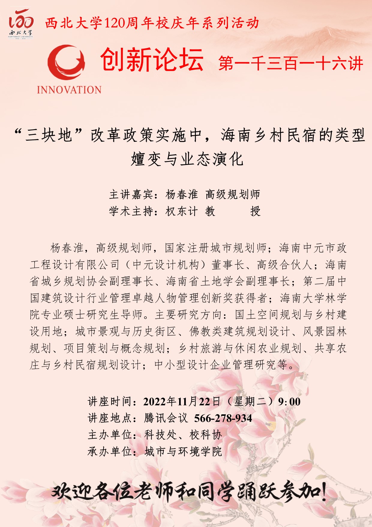 杨春淮 高级规划师 古天乐代言太阳集团城网址创新论坛第一千三百一十六讲暨120周年校庆年系列活动: “三块地”改革政策实施中,海南乡村民宿的类型嬗变与业态演化 讲座时间 2022年11月22日(星期二)9:00 讲座地点 腾讯会议 566-278-934 讲座人介绍 杨春淮 高级规划师 讲座内容