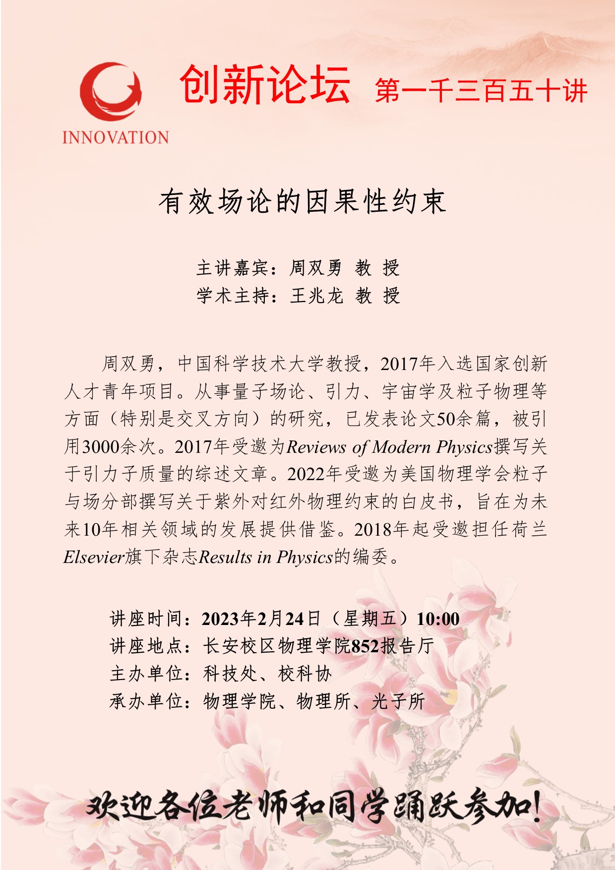 周双勇 教授 古天乐代言太阳集团城网址创新论坛第一千三百五十讲: 有效场论的因果性约束 讲座时间 2023年2月24日(星期五)10:00 讲座地点 长安校区物理学院852报告厅 讲座人介绍 周双勇 教授 讲座内容