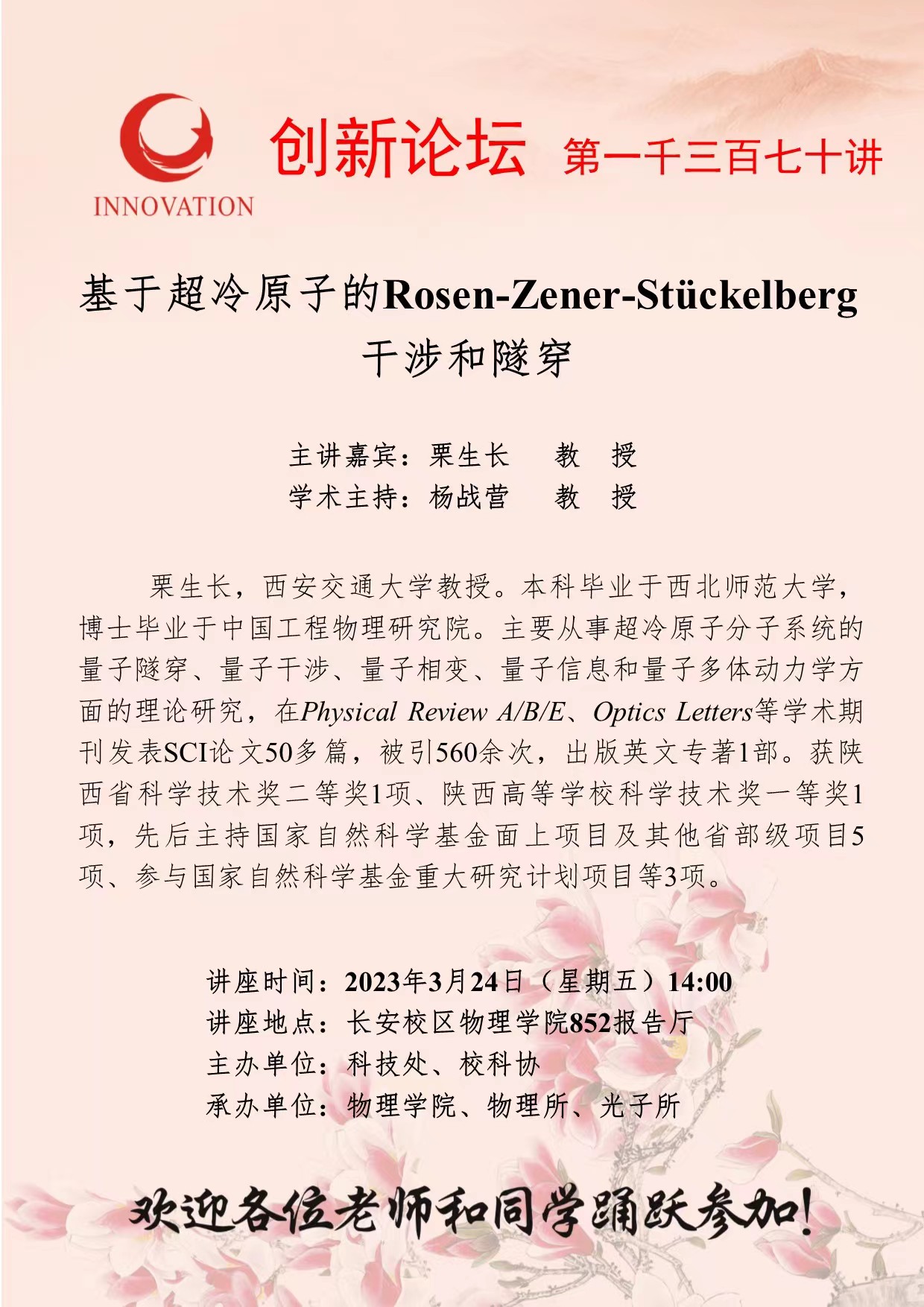 栗生长 教 授 古天乐代言太阳集团城网址创新论坛第一千三百七十讲:基于超冷原子的Rosen-Zener-Stückelberg干涉和隧穿 讲座时间 2023年3月24日(星期五)14:00 讲座地点 长安校区物理学院852报告厅 讲座人介绍 栗生长 教 授 讲座内容