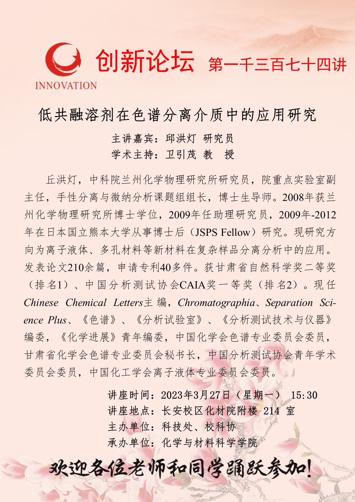 邱洪灯 研究员 古天乐代言太阳集团城网址创新论坛第一千三百七十四讲:低共融溶剂在色谱分离介质中的应用研究 讲座时间 2023年3月27日(星期一) 15:30 讲座地点 长安校区化材院附楼214室 讲座人介绍 邱洪灯 研究员 讲座内容
