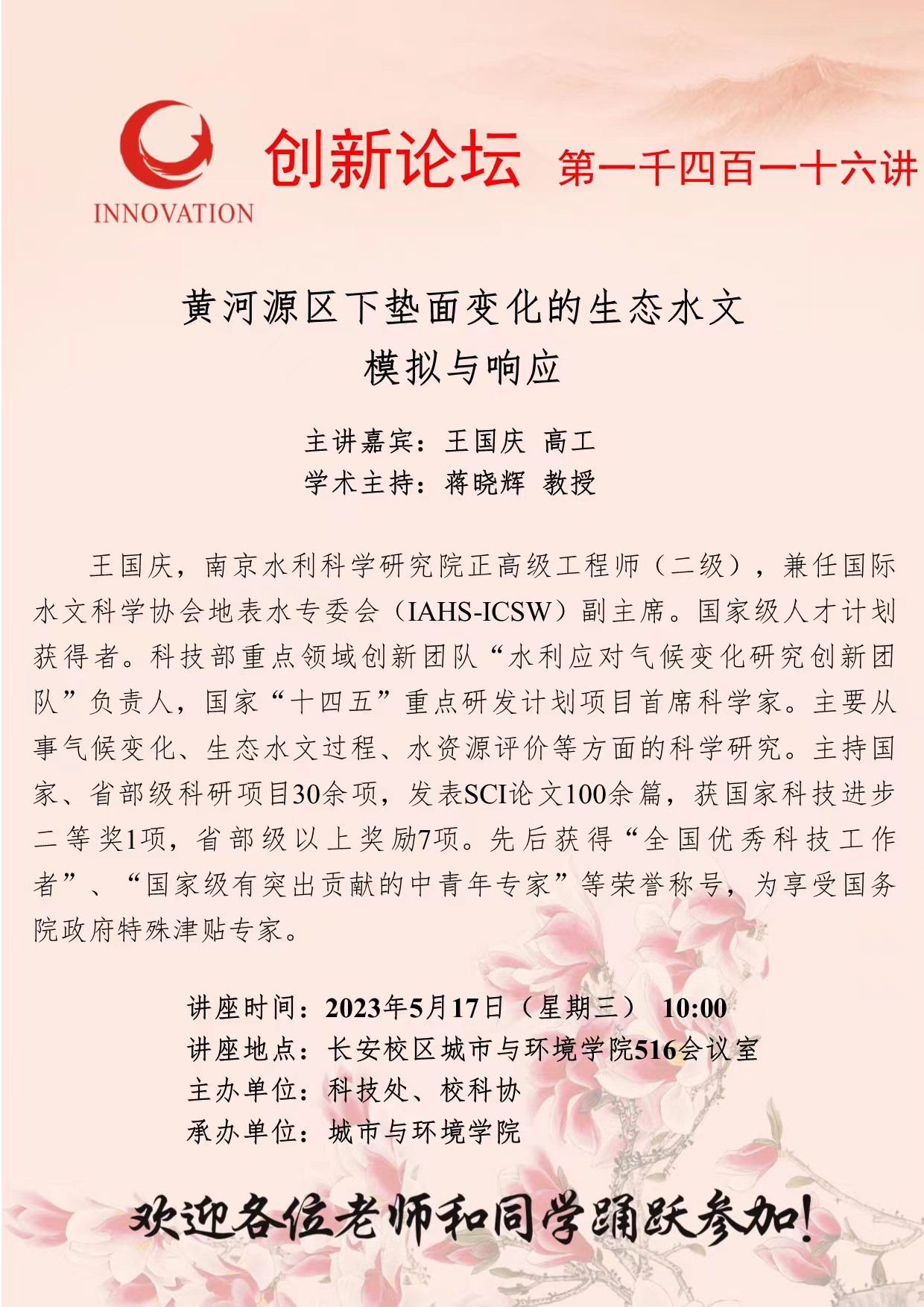 王国庆 高工 古天乐代言太阳集团城网址创新论坛第一千四百一十六讲:黄河源区下垫面变化的生态水文模拟与响应 讲座时间 2023年5月17日(星期三) 10:00 讲座地点 长安校区城市与环境学院516会议室 讲座人介绍 王国庆 高工 讲座内容