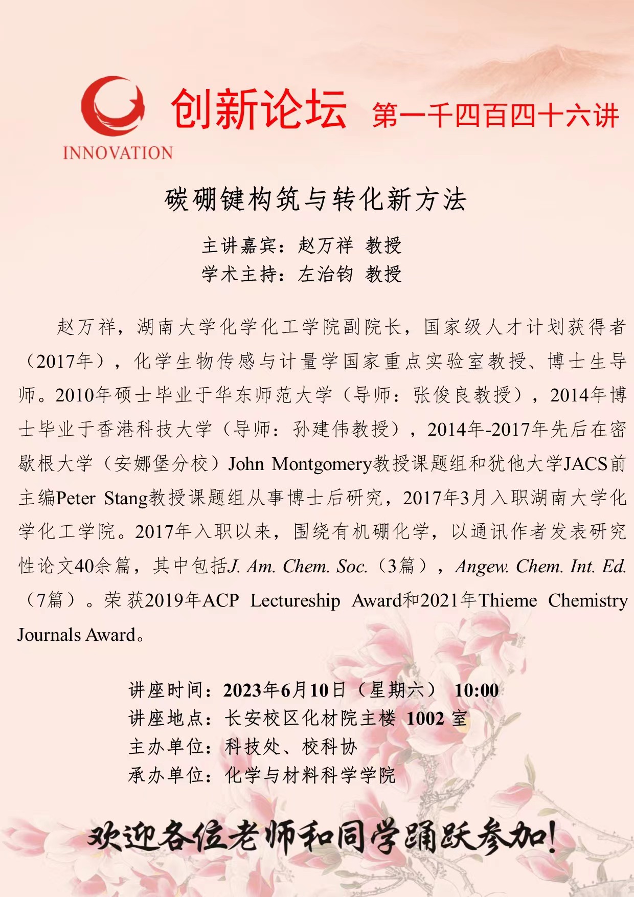 赵万祥 教授 古天乐代言太阳集团城网址创新论坛第一千四百四十六讲:碳硼键构筑与转化新方法 讲座时间 2023年6月10日(星期六) 10:00 讲座地点 长安校区化材院主楼 1002 室 讲座人介绍 赵万祥 教授 讲座内容