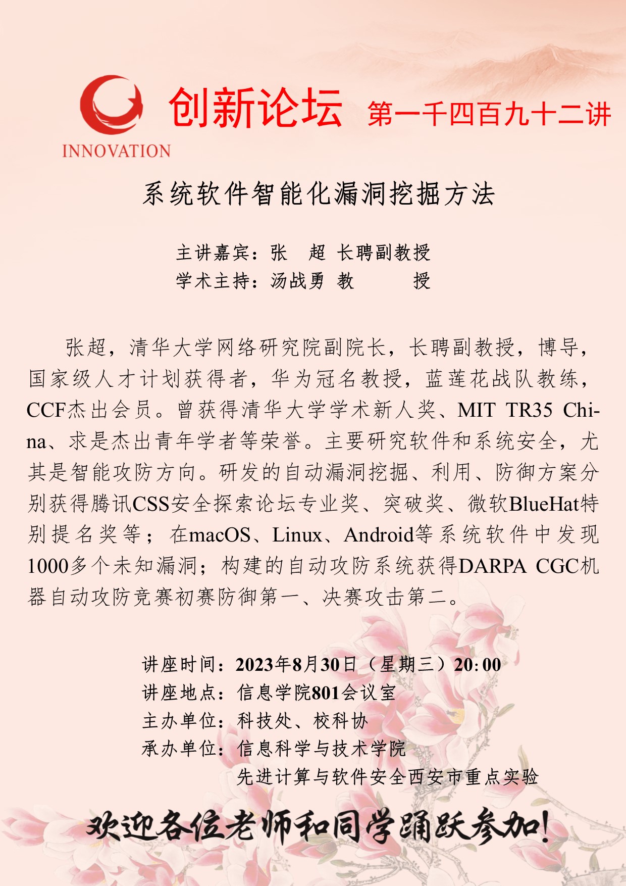张超 长聘副教授 古天乐代言太阳集团城网址创新论坛第一千四百九十二讲:系统软件智能化漏洞挖掘方法 讲座时间 2023年8月30日(星期三)20:00 讲座地点 信息学院801会议室 讲座人介绍 张超 长聘副教授 讲座内容