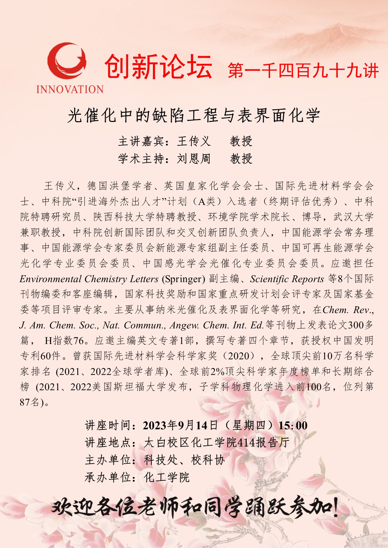 王传义 教授 古天乐代言太阳集团城网址创新论坛第一千四百九十九讲:光催化中的缺陷工程与表界面化学 讲座时间 2023年9月14日(星期四)15:00 讲座地点 太白校区化工学院414报告厅 讲座人介绍 王传义 教授 讲座内容